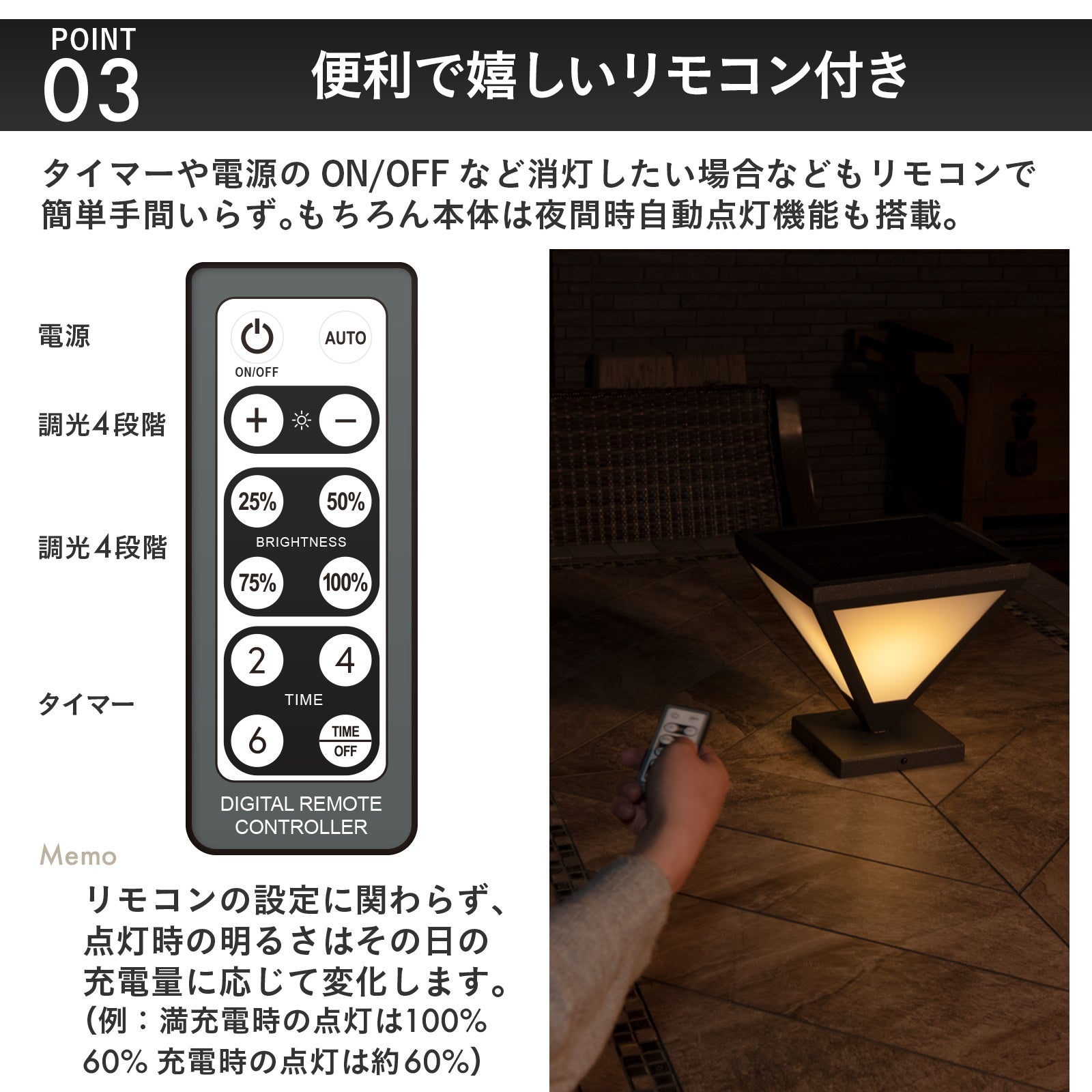 タイマーや調光、電源の ON/OFF をリモコンで操作できます。明るさの調整や消灯したい場合などもリモコンで簡単手間いらず。もちろん本体は夜間時に自動点灯機能を搭載しています。