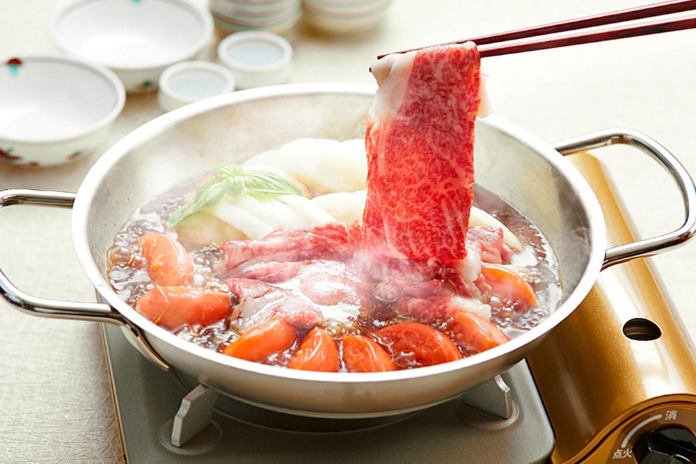 甘辛醤油味の割り下にトマトの酸味をプラスした、新しいすきやきの形を提示する名物料理です。