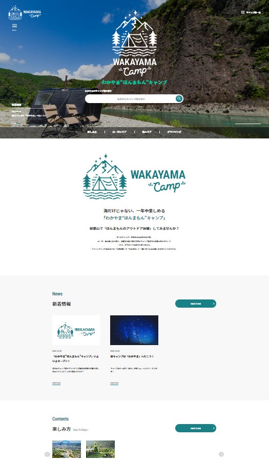 県内35か所(2022年10月時点)のキャンプ場を紹介するWEBサイト「わかやま“ほんまもん”キャンプ」を開設。「山・川エリア」「海エリア」「グランピング」と、カテゴリ別に紹介しており、お好みのキャンプフィールドやスタイルに合ったキャンプ場を探すことができます。 さらに、キャンプの前後に立ち寄ることの多い道の駅や近隣温泉施設といったキャンプ場周辺施設表示のほか、「ペット可」「WEB予約可」が一目でわかるアイコン表示など、キャンパーの求める情報が集約されています。海だけでなく、多彩なキャンプフィールドを擁する和歌山県ならではのキャンプの楽しみ方や、新着情報の発信も行っていく予定です。