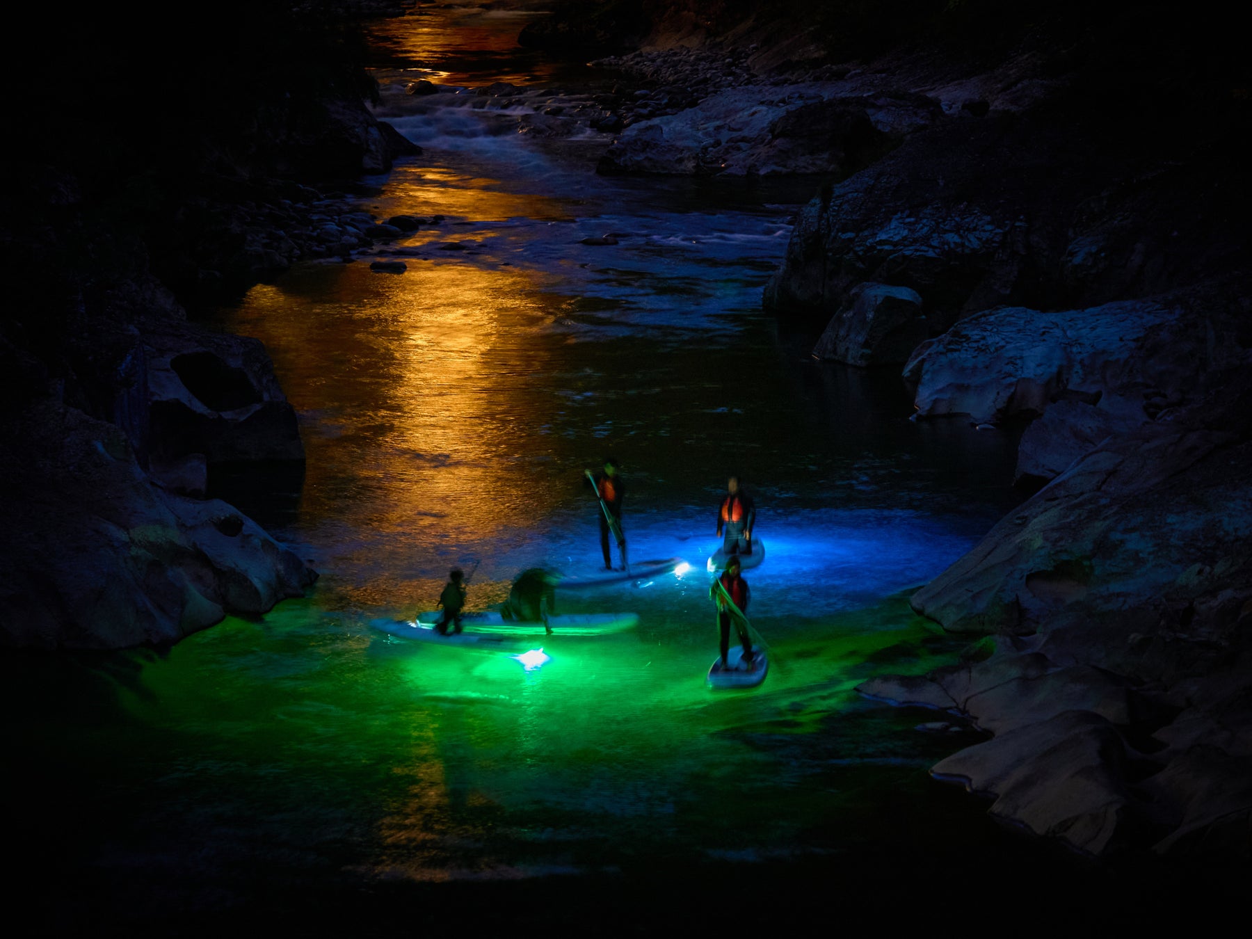 紅葉橋の下では、ライトアップされたSUPでゆったりクルージング。幻想的な光の中を進む、夜ならではの特別なアクティビティです。