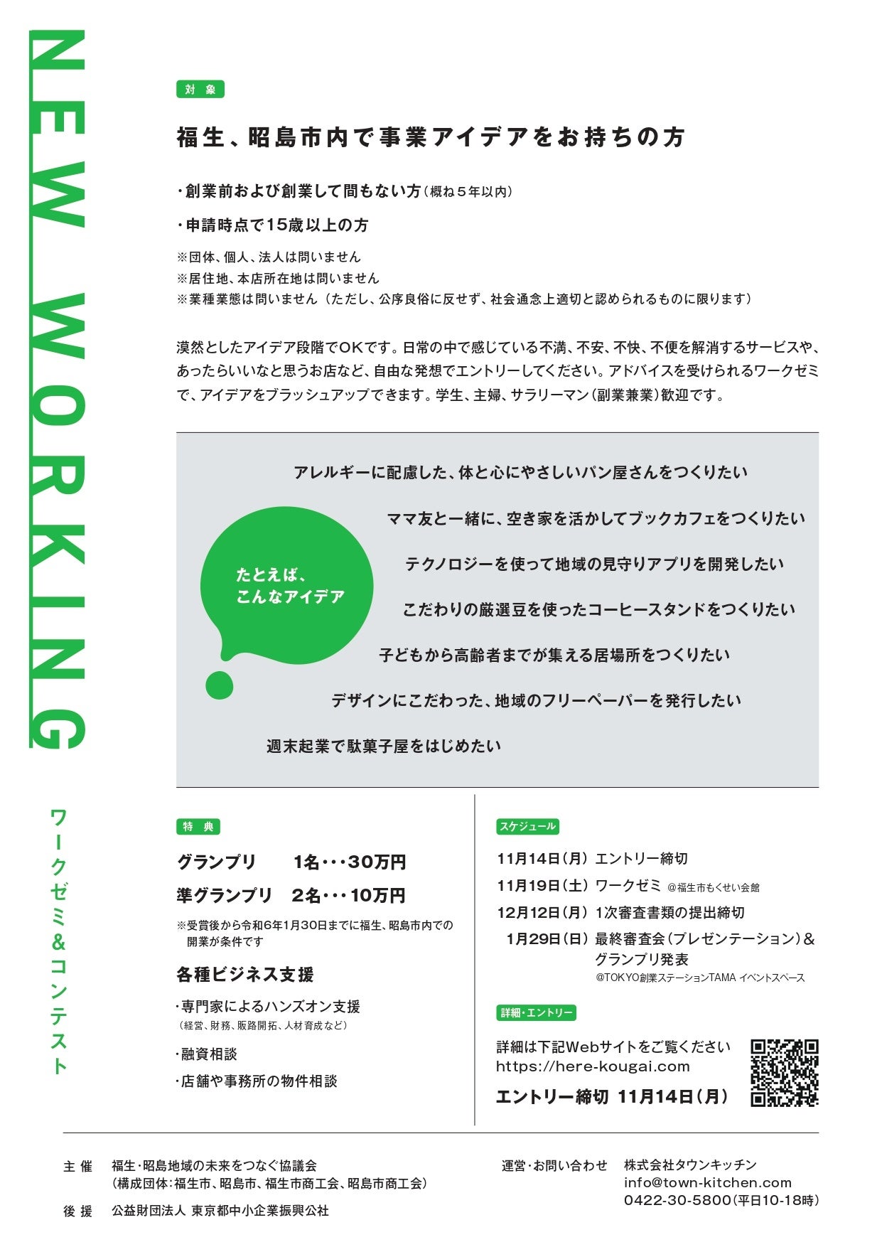福生市・昭島市の魅力創出を目指すワークゼミ&コンテスト「NEW WORKING」。学生や主婦、会社員などの創業希望者や、創業後間もない方を対象に、事業アイデアの募集を開始しました。例えば、アレルギーに配慮したパン屋、空き家を活かしたブックカフェ、地域の見守りアプリなど、日常で感じる不満、不安、不快、不便を解消するサービスや、あったらいいなと思うお店等の事業アイデアを幅広く募ります。
