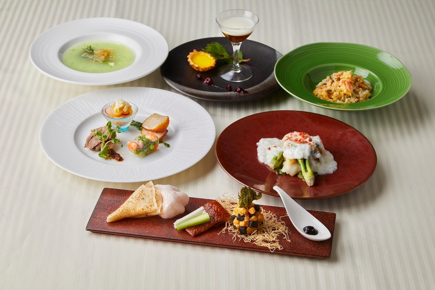 主菜:タラの芽味噌の北京ダック タラの芽と海老のすり身パン包み揚げ 2種盛り合わせ、タラの芽と白身魚のあっさり炒め 蟹のスフレとともに