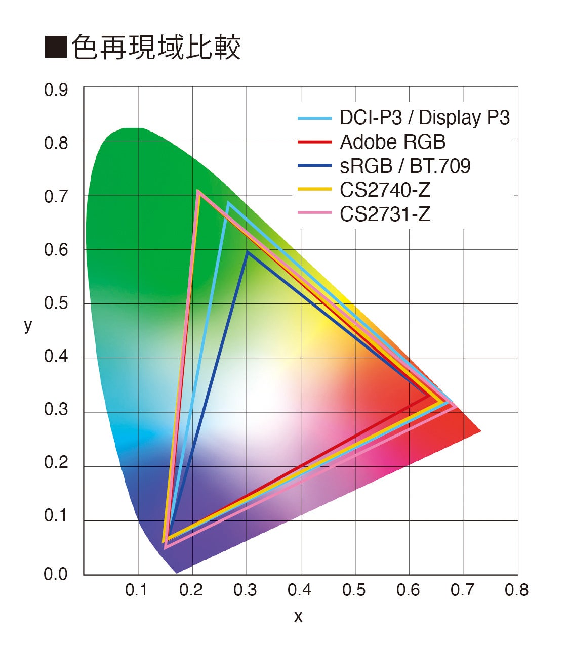 Adobe RGBを99%カバーする広色域表示や、キャリブレーション対応など、優れた色表示を実現する各種性能は前機種を踏襲。CS2740-Z/CS2731-Zは、デジタル写真やデザイン、印刷に加え、3DCG、映像制作まであらゆるクリエイティブワークに適しています。