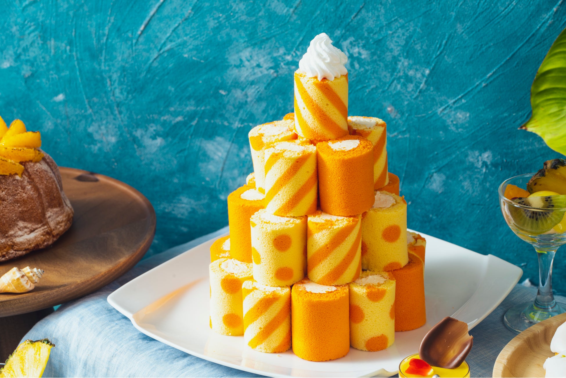 マンゴー風味のスポンジと果肉入りのマンゴークリームで見た目もキュートなロールケーキタワーは、大人心をくすぐる遊び心の詰まった一品です。