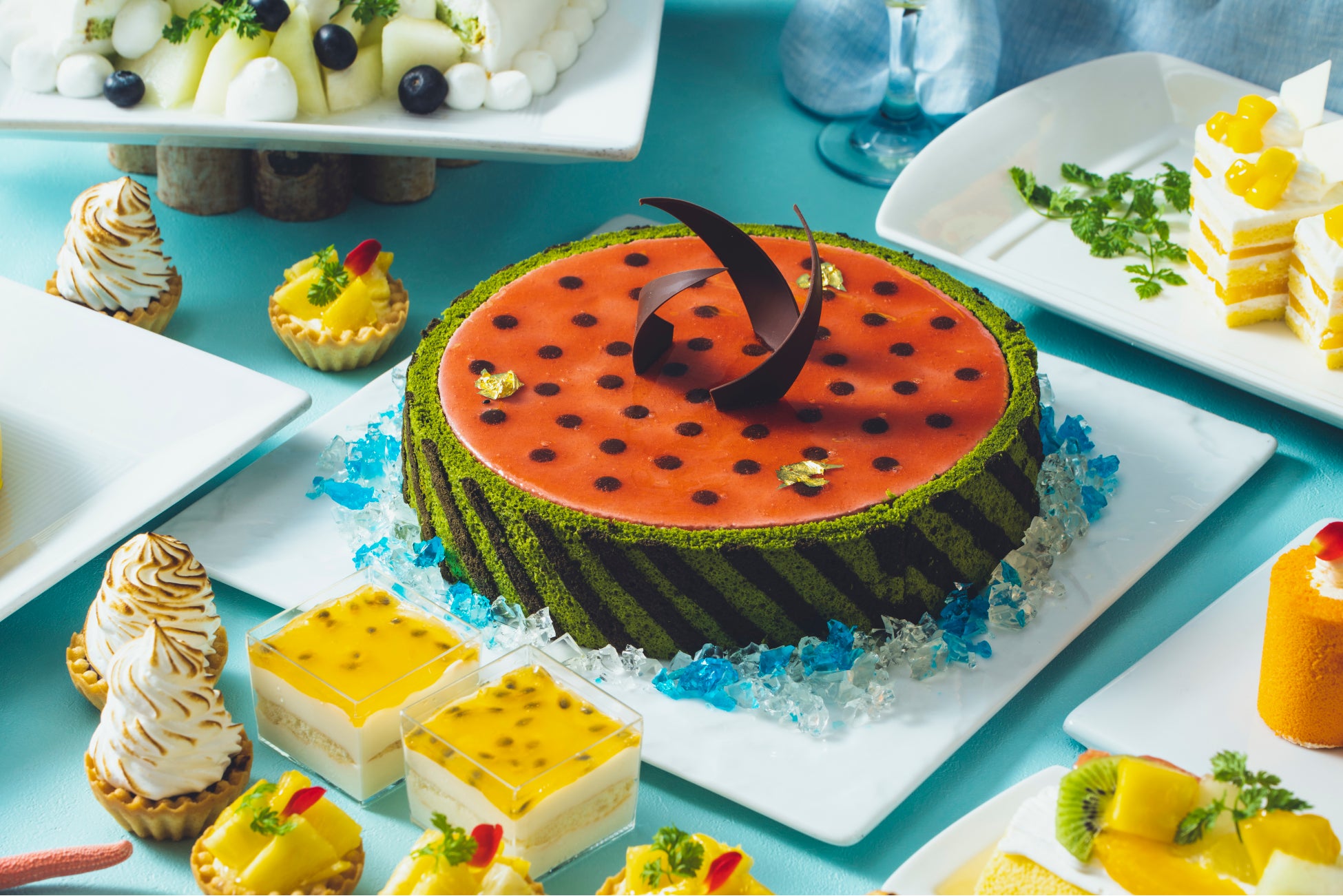 オールデイダイニング「グランドキャッスル カフェ&ダイニング」では四季に合わせスイーツビュッフェを提供し、今回は初夏をテーマに常夏の島「沖縄」で生産されたフルーツをふんだんに使用したスイーツをご用意いたします。心とお肌がトキメク、可愛いサマースイーツたちがビュッフェ台を彩ります。
