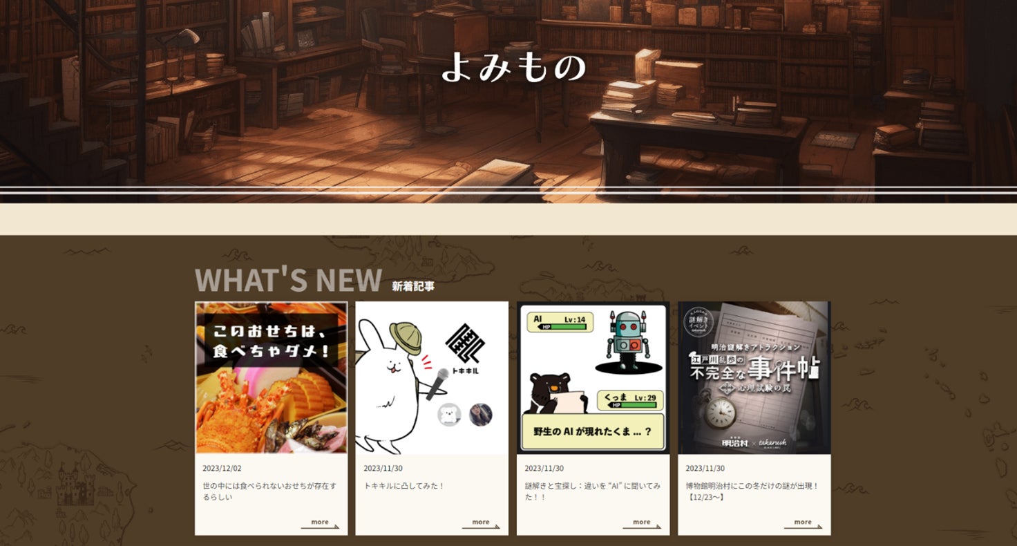 TAKARA PORTは、宝探し・謎解きに関する知識や、謎制作者のインタビュー記事などの “よみもの” と呼ばれるコンテンツページが非常に充実しています。その構成は背景の挿入や写真の添付など記事によって全く異なりますが、ノーコードで記事作成が可能なメルカートの「ページ機能」を活用し、ページの量産を実現しています。