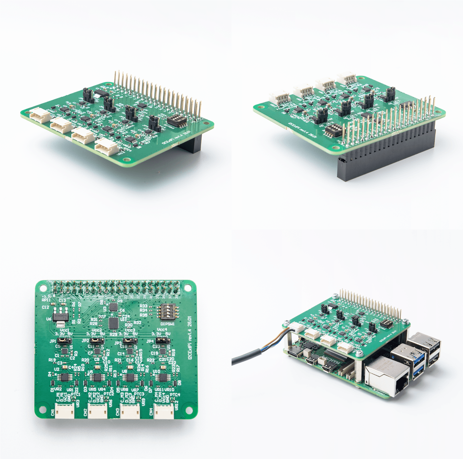 インターフェース基板は4ch入力を備え、I2Cで接続可能なセンサを自由に組み合わせることができます。異なる種類のセンサだけでなく、同じ種類のセンサを複数個接続して使用できるため、同一の測定対象の多点計測が可能です。 また、I2Cバス延長技術(エキスパンダ)を実装して標準5m(最大15m)の長距離配線に対応しています。