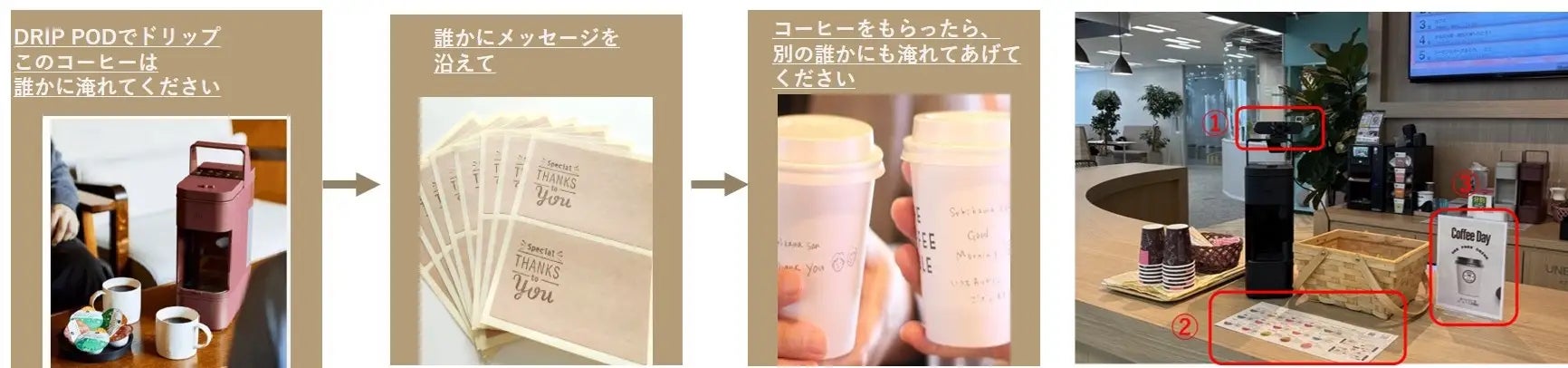 その際「Thanks Brew-感謝を淹れる」ができるようペンと感謝シールを設置した