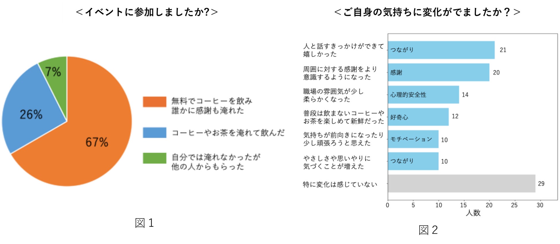 図2は、イベント実施後の気持ちの変化についての結果です。参加者の3割以上が本施策のテーマであった、「つながり」や「感謝」を気持ちの変化として捉えており、職場の心理的安全性やモチベーションにつながることも示唆されました。フリーコメントとしても、「感謝のコメントと一緒にコーヒーをもらって、嬉しい気持ちになった、また自分にできることを一生懸命やろう!とポジティブな気持ちになれました。」「お客様同士が初対面だったこともあり、打ち解けるきっかけとしてイベント参加いただいたお客様にお渡しました」などがありました。