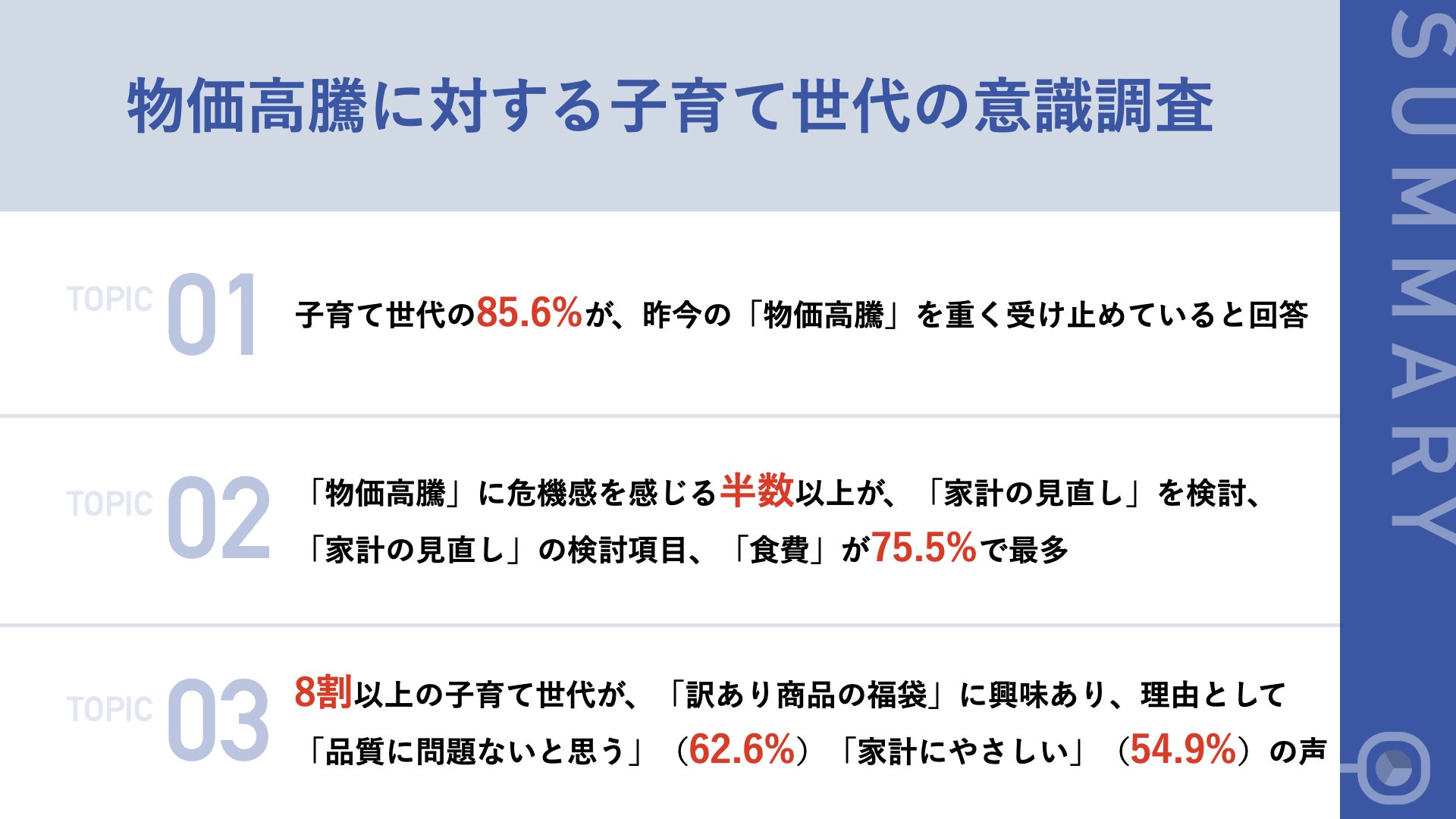 今回の調査では、昨今の「物価高騰」により多くの子育て世代が危機感を露わにしており、家計の見直しとして「食費」を抑える方法を考えるも、これ以上どう節約すれば良いのか分からないといった心の声が垣間見えました。「訳あり商品の福袋」について、8割以上から関心を集めており、食費の節約と同時に食べ物を捨てずに済むという環境問題が解消されることに魅力を感じる声も挙がりました。今後も続くと想定される物価の上昇により、家計への打撃が広がることを考えると、「訳あり商品の福袋」はフードロス削減のために割高な商品を買うわけではないため、家計の味方として心強いサービスと言えるのではないでしょうか。