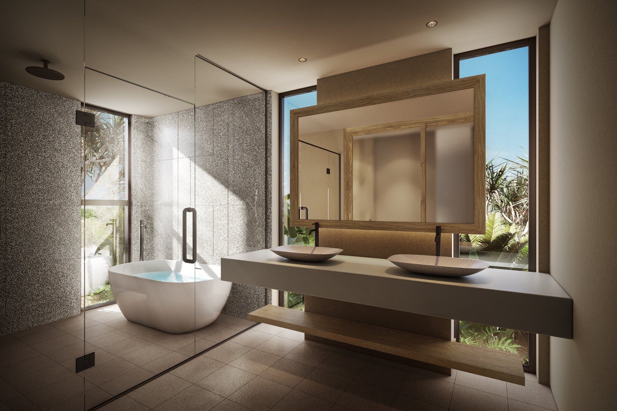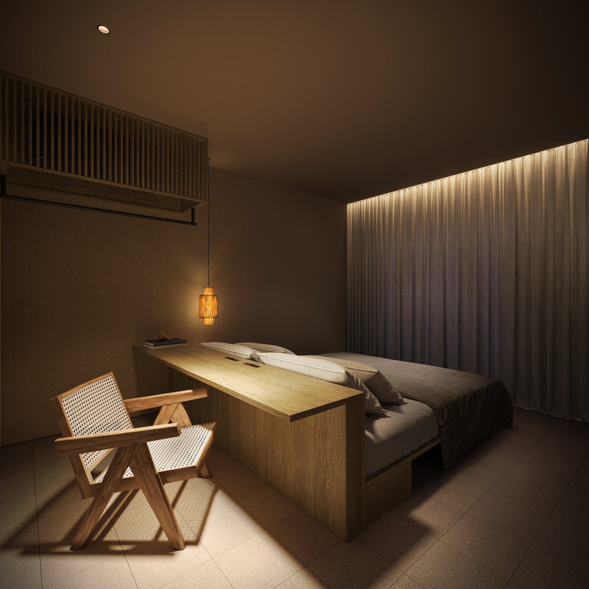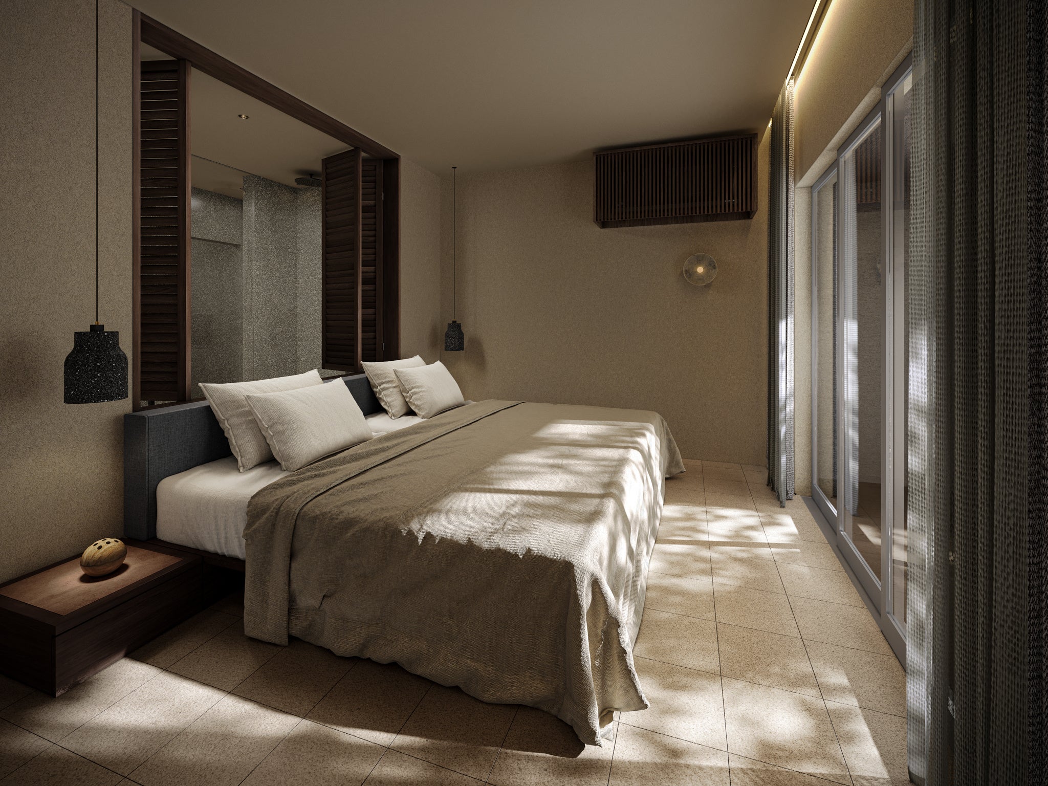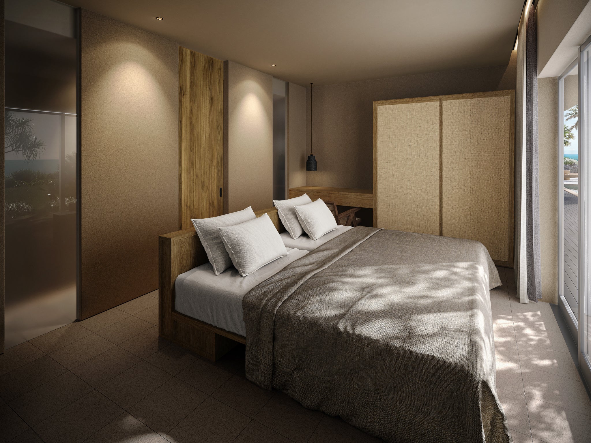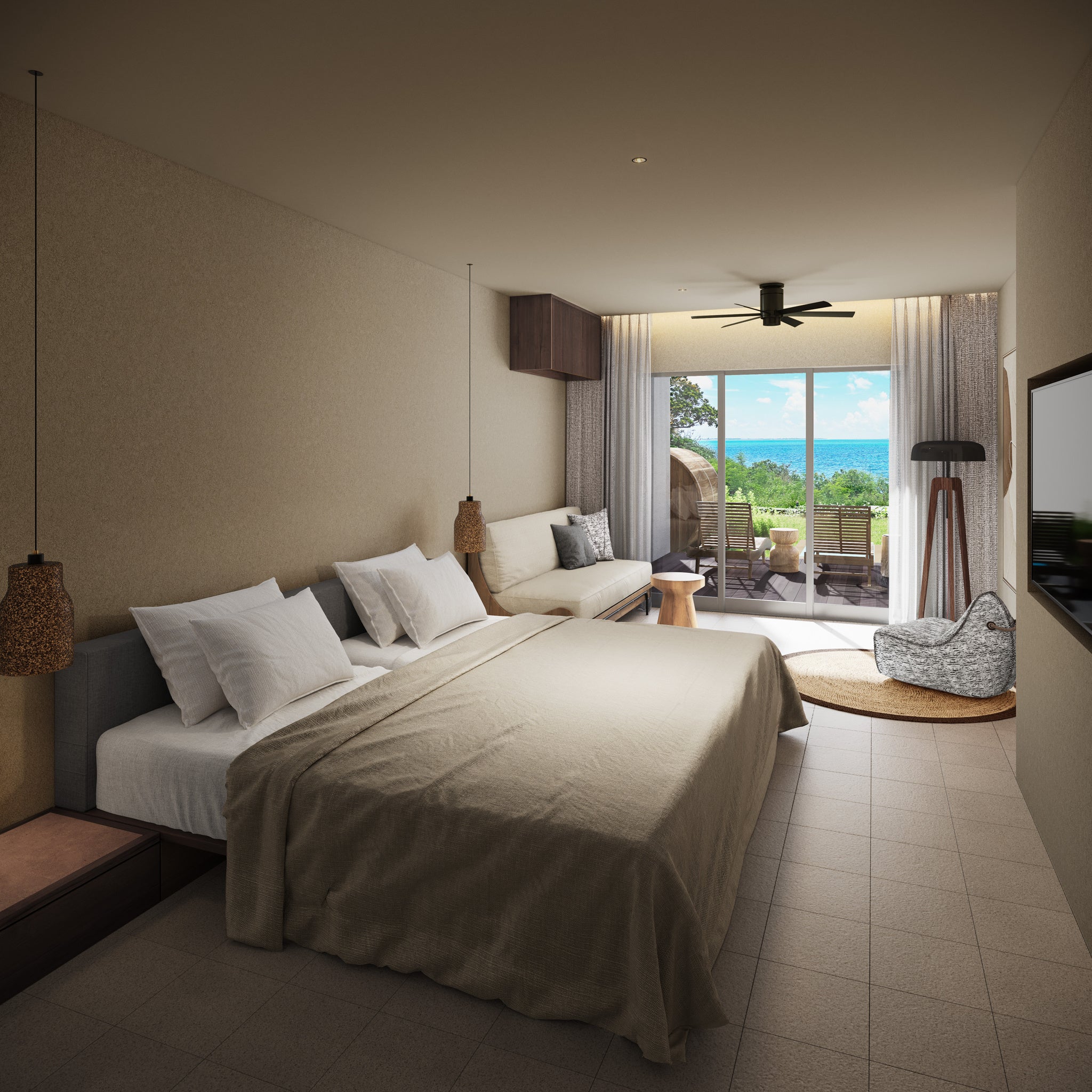 2ベッドルームに広々としたダイニングリビングがあるゲストルーム。プライベートプールのあるテラスにはパノラマ仕様のバレルサウナと水風呂があります。心地よい海風に揺られながら、思う存分サウナをお楽しみいただけます。