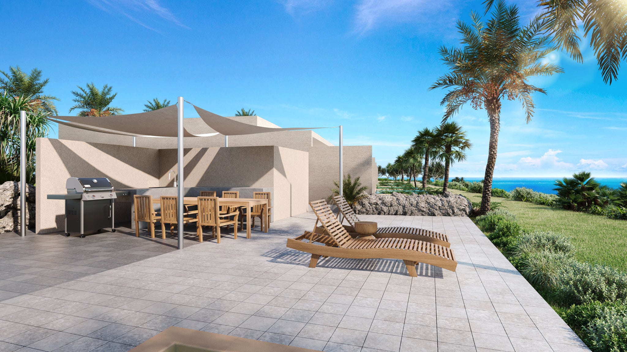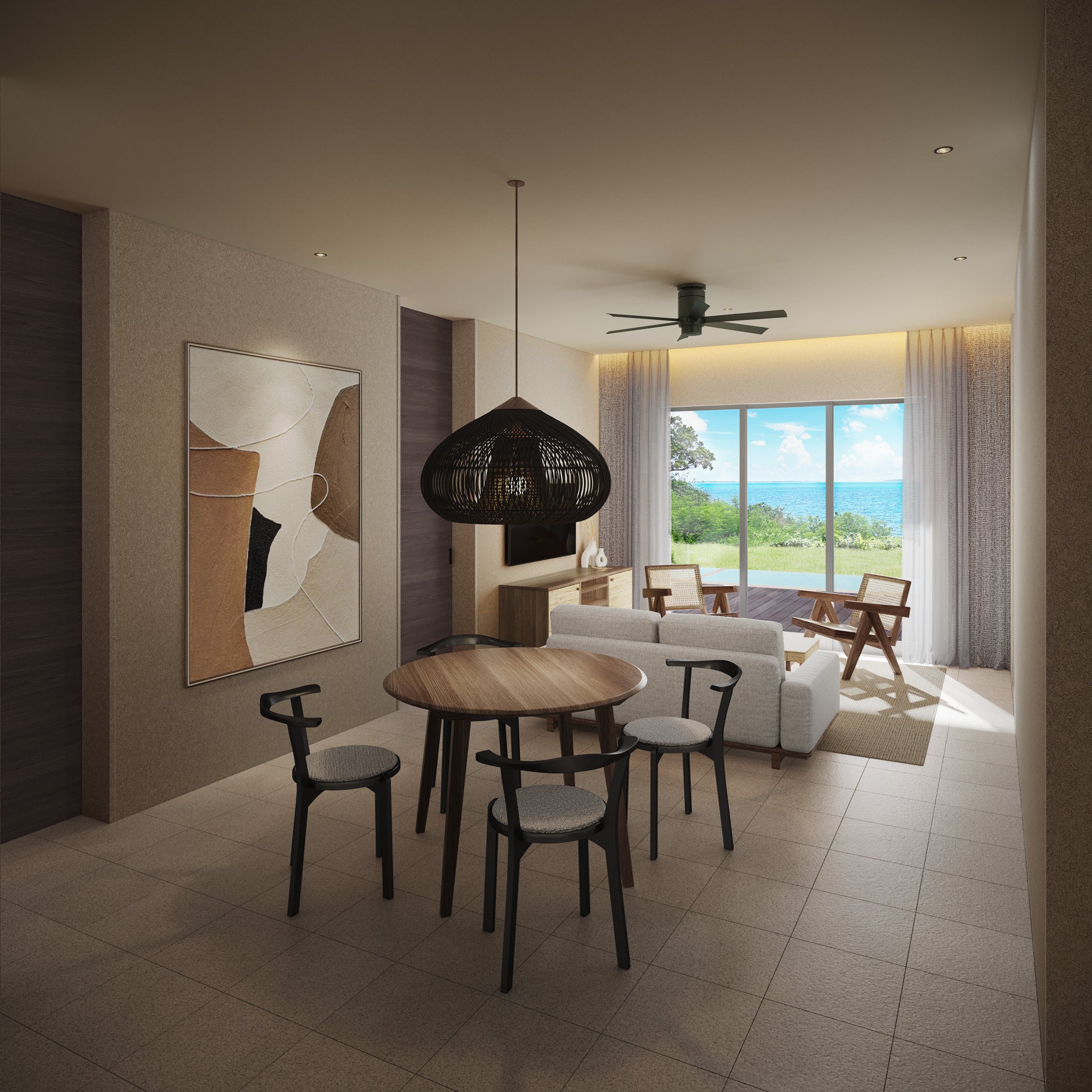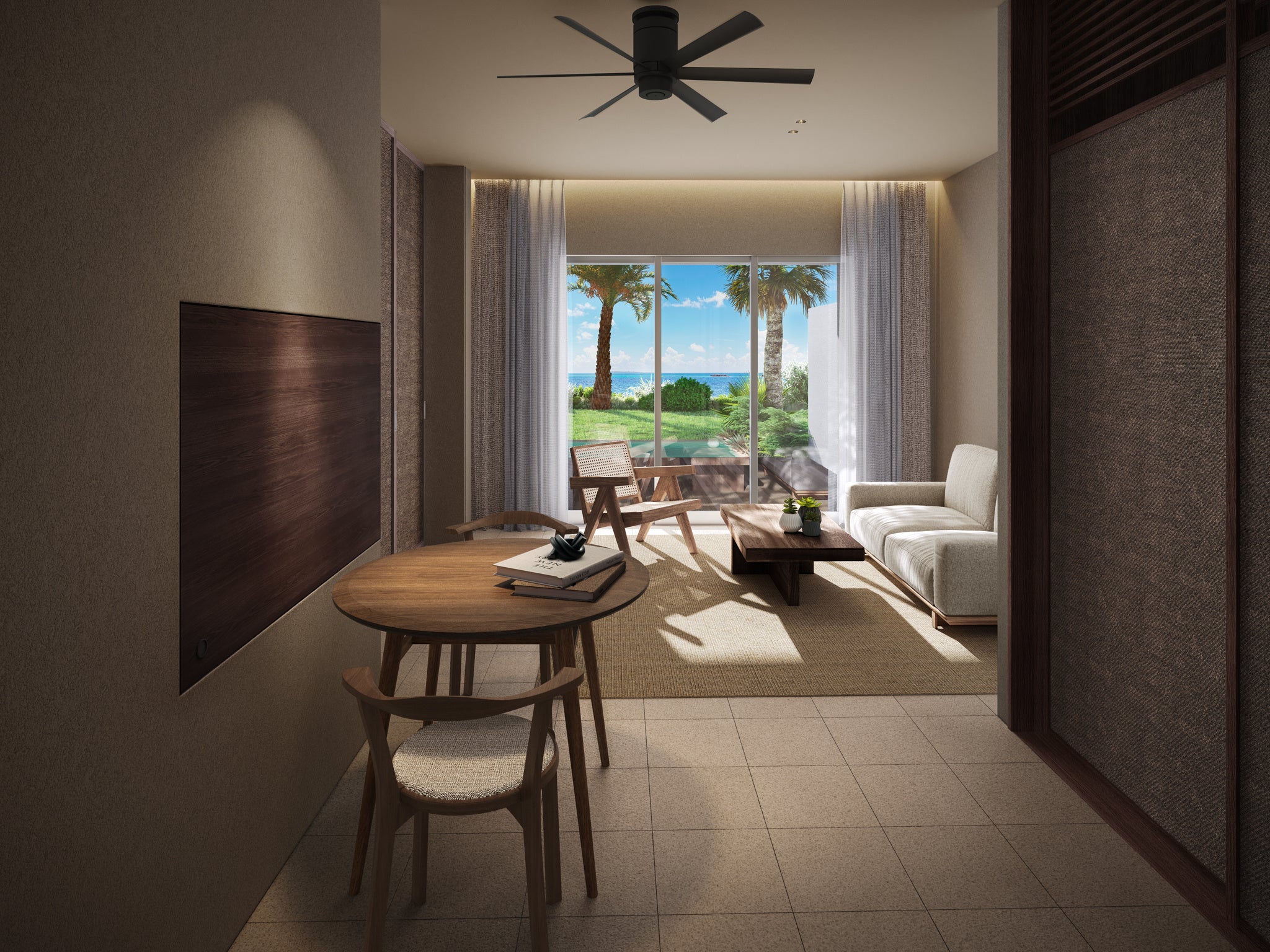 2ベッドルームに開放的なリビング・ダイニングがあるゲストルームです。特にリビング・ダイニングにある開放的な窓から宮古ブルーの大海原を一望しながら波の静けさをお楽しみいただけます。プライベートプール、BBQエリア付きテラスがあり、心地よい海風に揺られながら開放的で自然を感じる体験をご堪能ください。