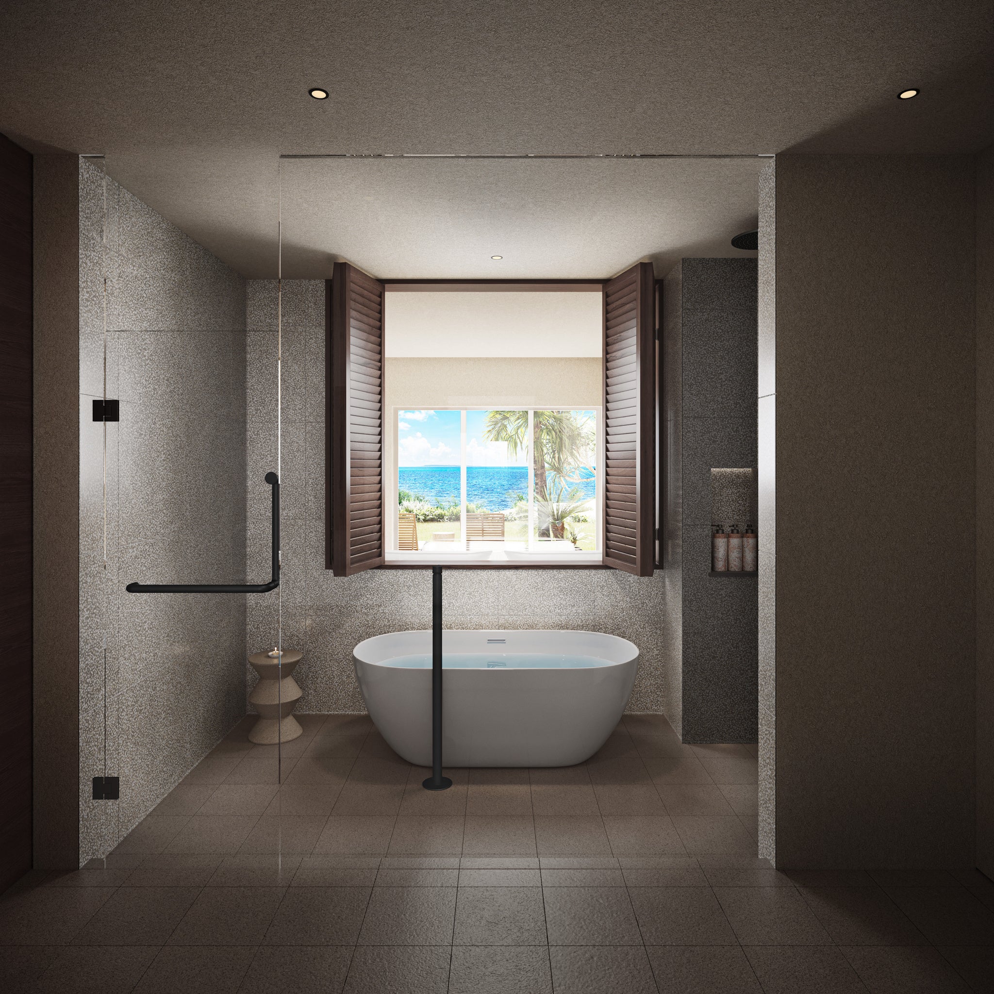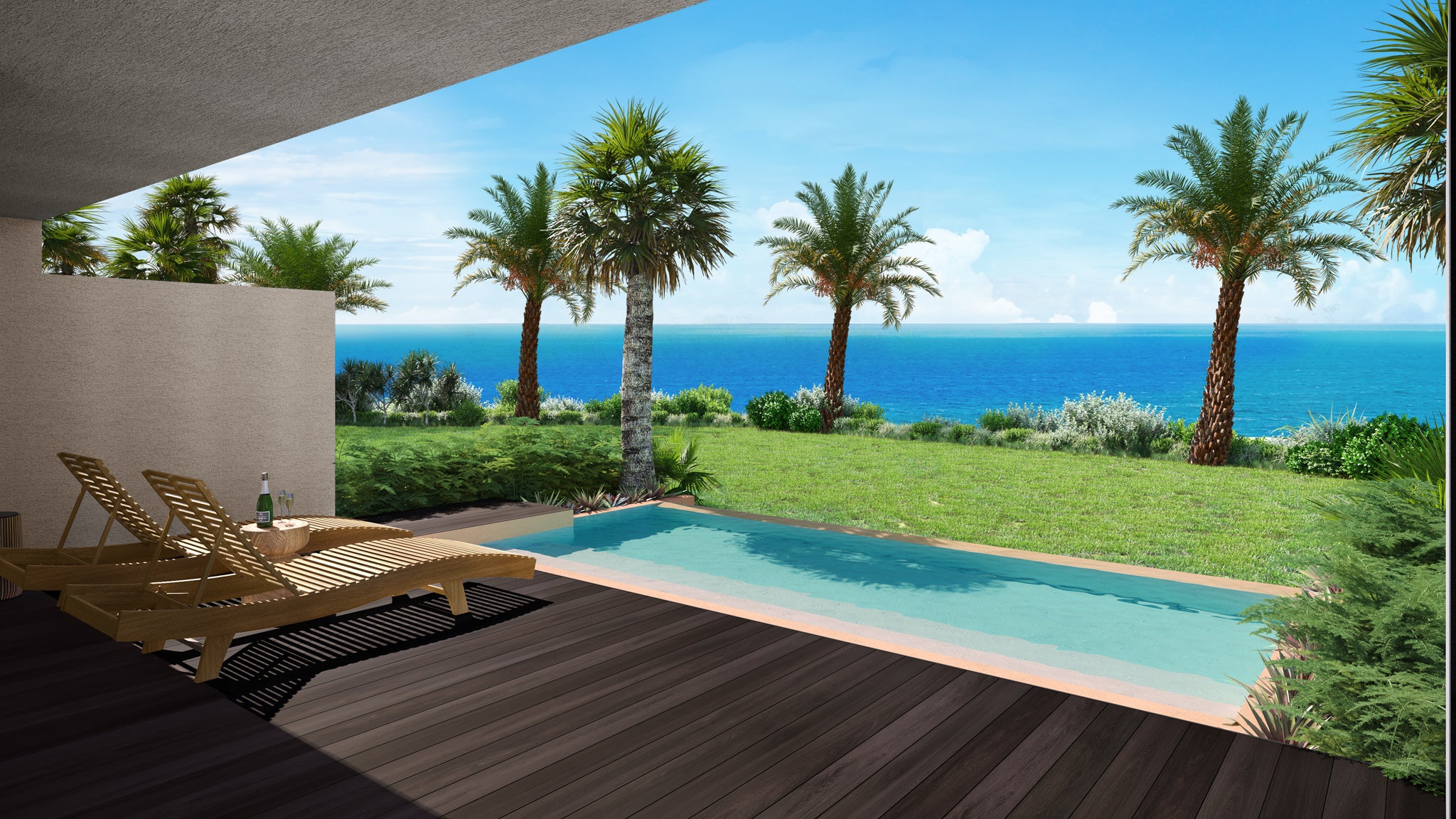 1ベッドルームにリビングとプライベートプールテラスが付いたゲストルーム。バスルームからも宮古ブルー海が見えるほか、南向きの窓からは心地よい朝日が差し込み、自然を感じる朝も体験いただけます。