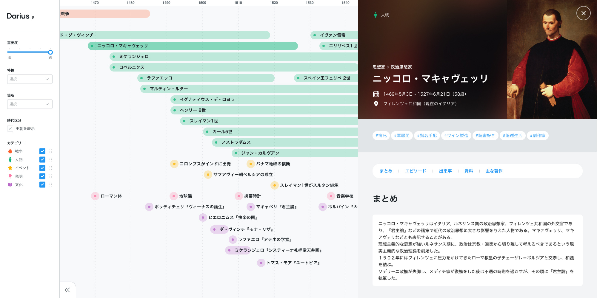 Apple Podcast ランキング1位*の「歴史を面白く学ぶコテンラジオ(COTEN RADIO)」を運営する株式会社COTEN(代表取締役:深井龍之介、以下:COTEN)は、12月6日に世界史データベースを限定公開したことをお知らせします。今回限定公開するのは、世界史データベースプロジェクトの中の、Webブラウザ上で人物・戦争・発明といった世界史の出来事を参照できる年表形式のアプリケーションです。世界史情報を俯瞰できる機能により、ユーザーへメタ認知のきっかけを提供することを目指しています。