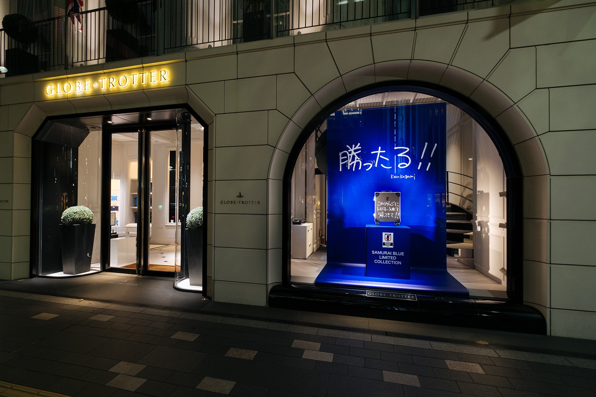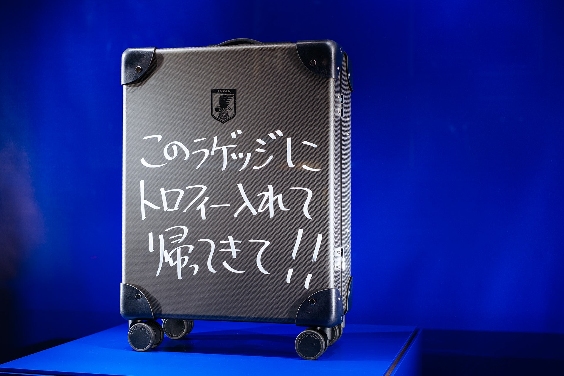 グローブ・トロッターはサッカー日本代表応援キャンペーンの一環として、現代美術作家の加賀美健氏とのコラボレーションにより、2022 年 11 月 18 日(金)から 12 月 4 日(日)まで、グローブ・トロッター 銀座店にて、加賀美健氏による直筆メッセージを施したサッカー日本代表モデルスーツケース を展示。