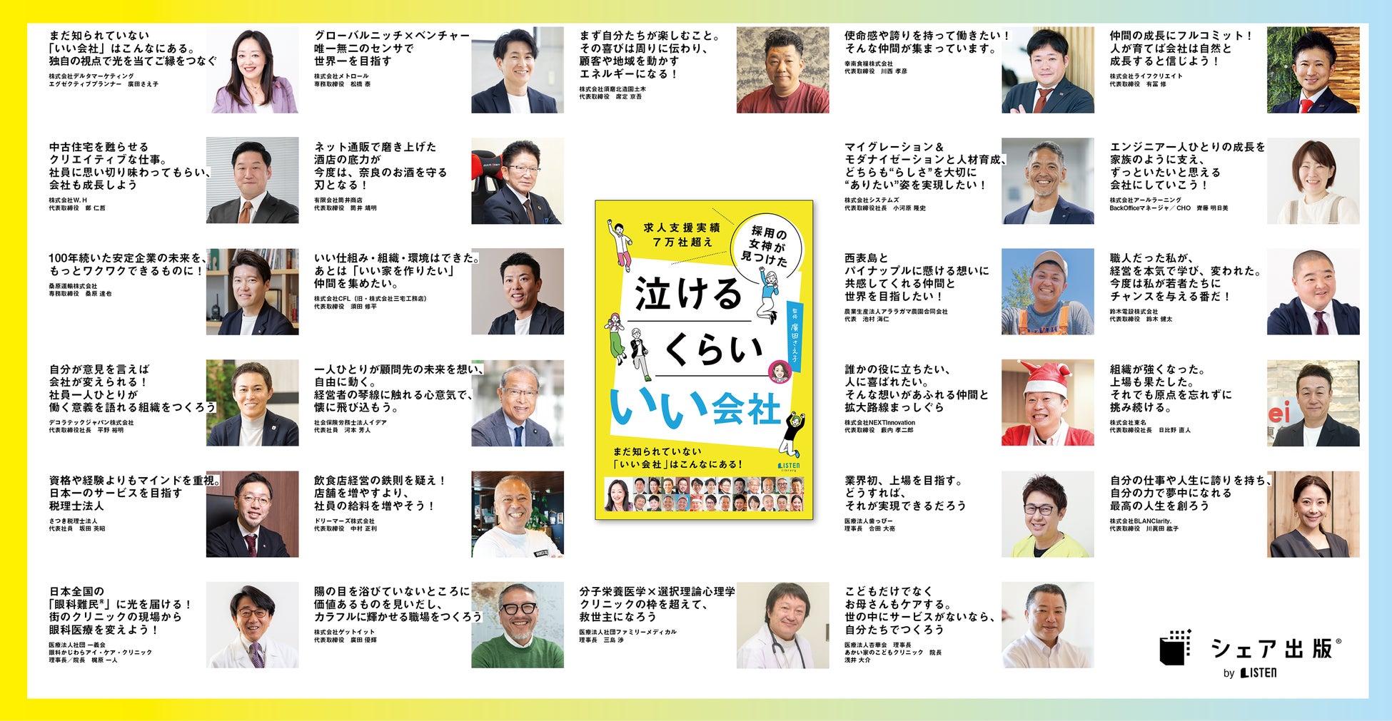 経営者を中心に累計1,000社・3,000名以上へインタビューを行い、書籍出版やウェブメディア運営を手がけるリスナーズ株式会社(東京都新宿区、代表者:垣畑 光哉、以下「当社」)は、書籍『泣けるくらい いい会社』をAmazon.co.jpより6月26日(木)に出版します。