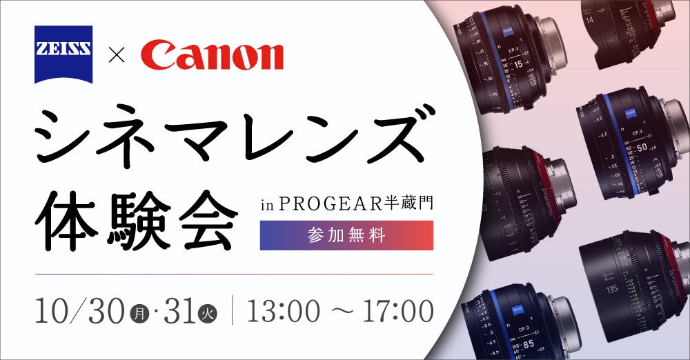 本イベントでは、カールツァイス製シネマレンズのCP.3シリーズ(PLマウント)とキヤノン製単焦点シネマレンズのSumire Prime (PLマウント)シリーズなどを多数展示。実際に触ってお試しいただける体験会です。会期中はカールツァイスの担当者が常駐し、製品について分かりやすくご案内します。