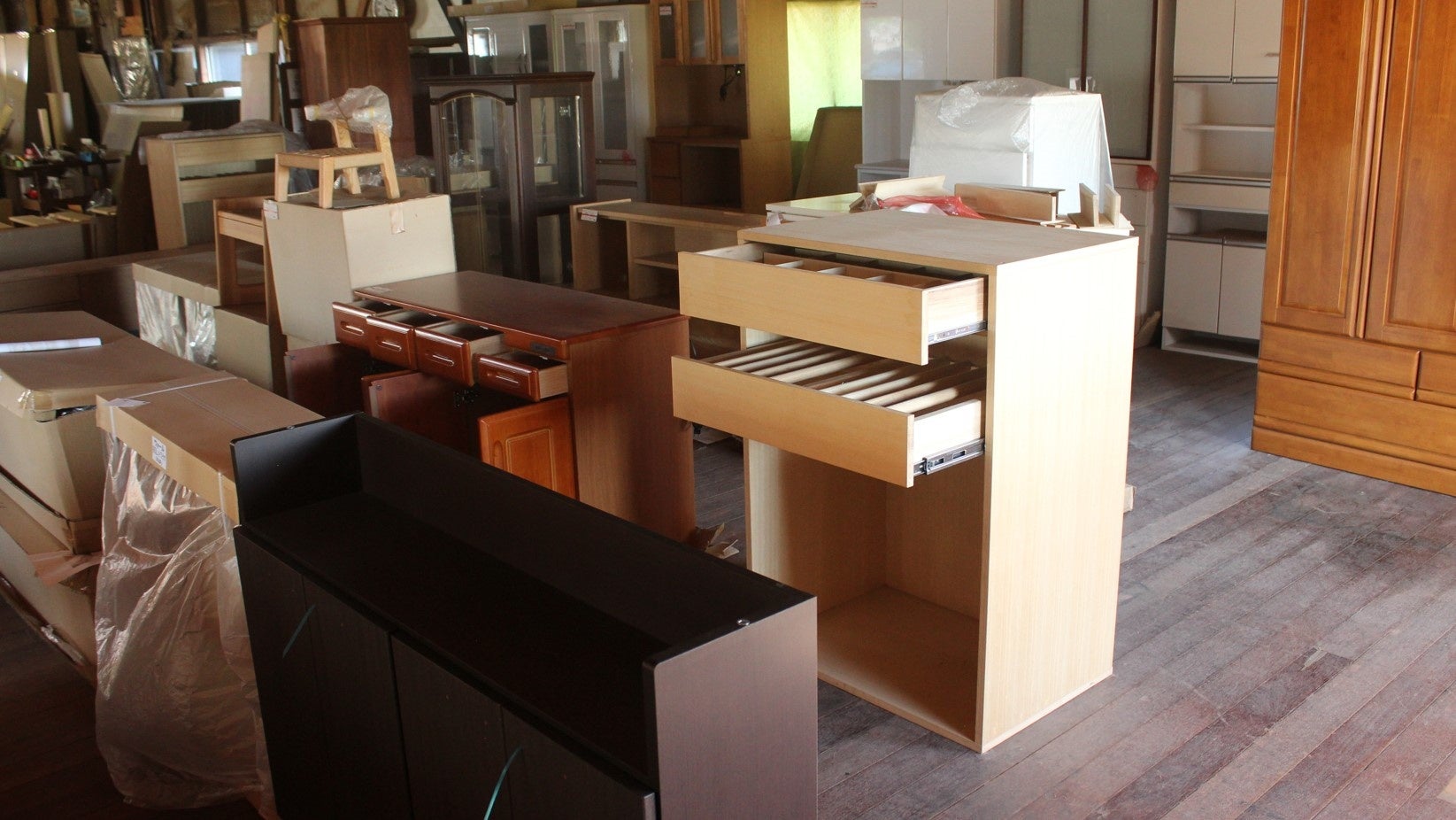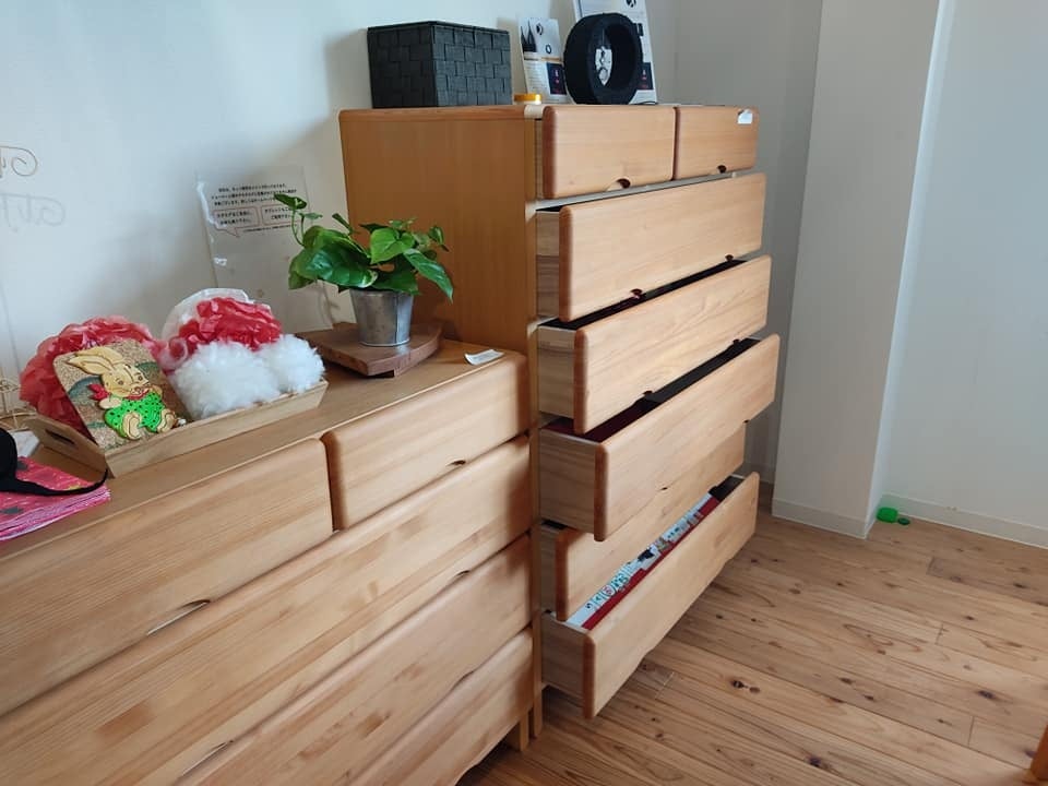 ご注文いただいた家具は、一旦梱包を解き、引き出しや扉などを開いて通気性の良い倉庫で保管しホルムアルデヒドが効果的に発散される環境を提供します。
