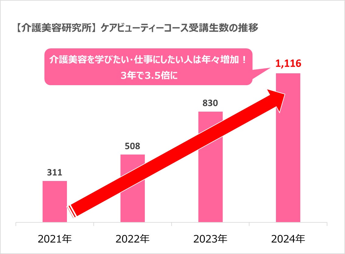 株式会社ミライプロジェクト(本社:東京都渋谷区、代表取締役:山際 聡)が運営する、高齢者向け美容サービスを専門とした人材を育成する「介護×美容」専門のプロフェッショナルスクール【介護美容研究所】は2018年に東京・原宿で開校しました。受講生は年々増加し、2024年の入学者は1,000名を突破しました。現在は全国6か所に校舎を展開しています。