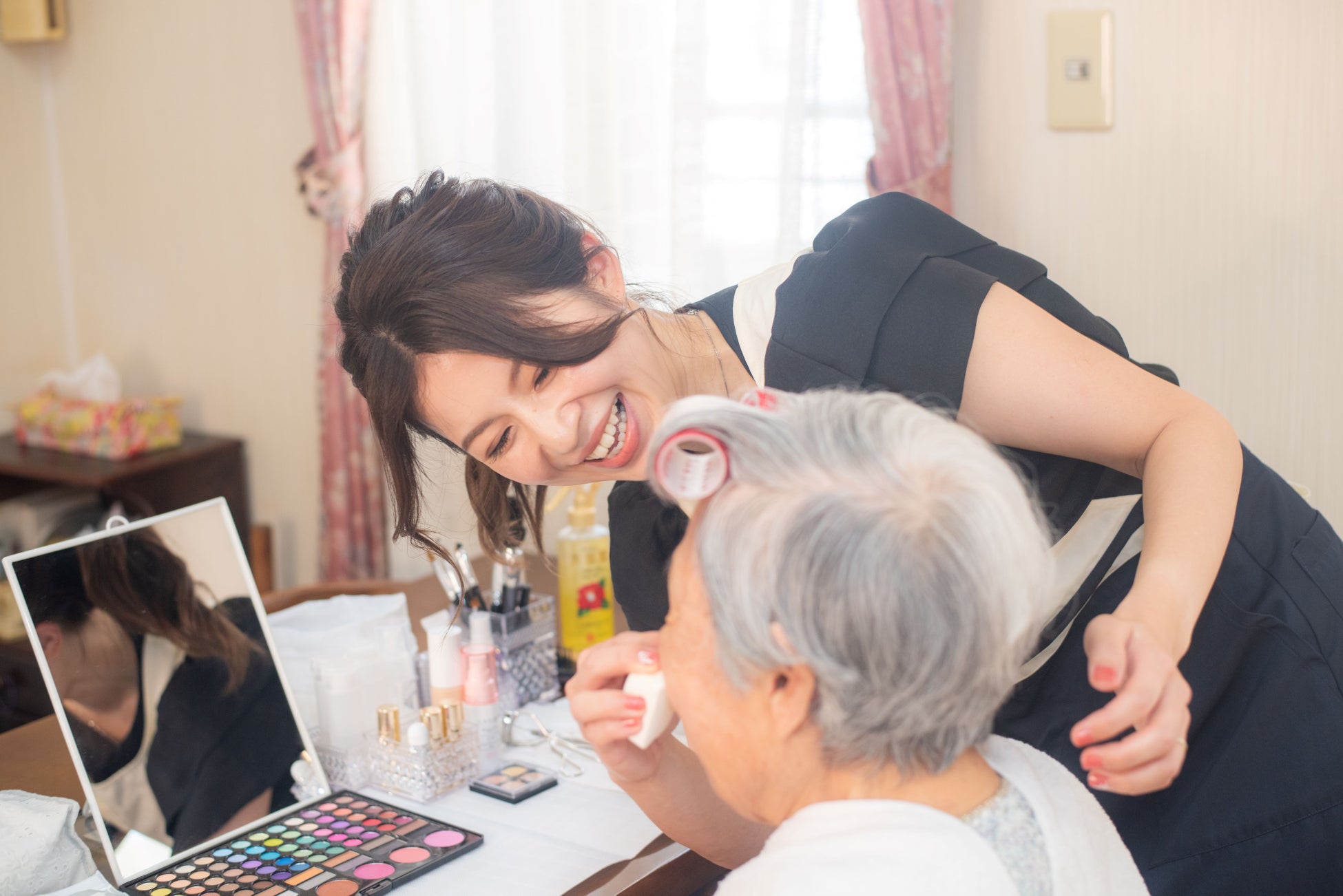 また、普段笑顔をほとんど見せなくなった認知症を持つ入居者の方がメイクをしたことで、 表情がパッと明るくなり、その姿を写真に収めてご家族に送ったところ、 ほとんど施設に来ることのなかったご家族が施設に訪れ、食事介助まで行うようになったこともありました。