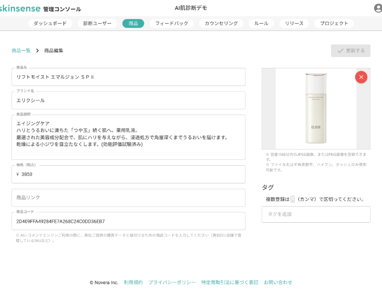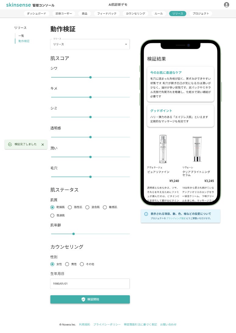 AI肌診断「skinsense」は、画像認識技術やデータサイエンスによるアプリ開発を行う株式会社Noveraが開発し、画像認識のブレイクスルーAI特許技術が活かされています。これまでにない導入のしやすさ、使い続けたくなる便利な機能をもつAI肌診断として、スキンケア・化粧品メーカー、健康食品メーカー、ドラッグストアなどの販促との親和性が高いのが魅力です。この度、その技術力に磨きをかけ、御社ビジネスに貢献できるよう、AI肌診断「skinsense」の機能を以下の通り、アップデートいたしました。