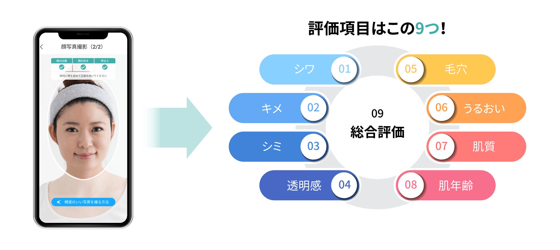 新たにPCで診断可能になったのをはじめ、スマホカメラに数秒、顔を映すだけで9つの評価項目[シワ、キメ、シミ、透明感、毛穴うるおい、肌質、肌年齢、総合評価]を測定します。肌質まで分析し、的確な肌年齢はわかります。