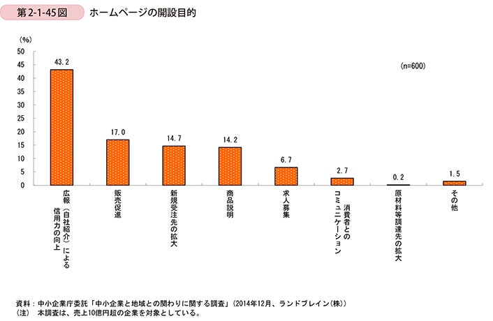 中小企業庁発行の中小企業白書(※1)によれば、中小企業の内60%以上の企業がホームページを保有しており、その目的としては「自社紹介による信用力の向上」が最も高くなっています。