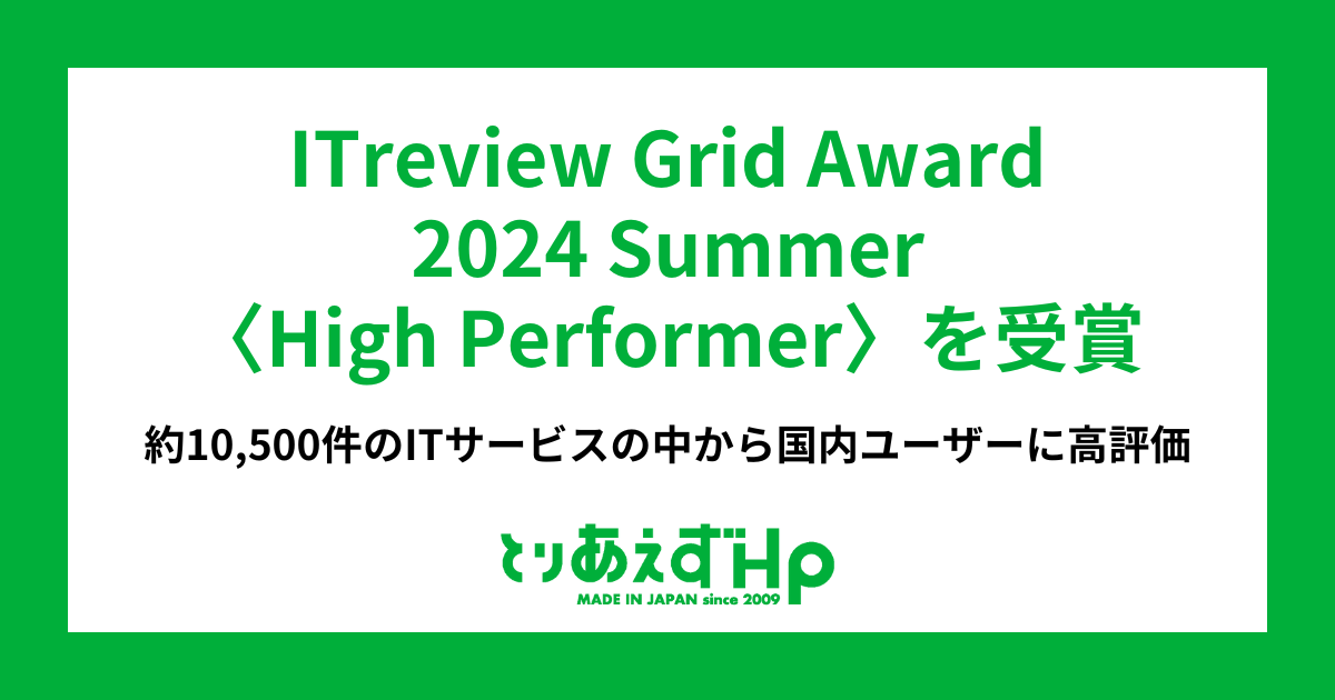 「とりあえずHP」が約10,500件のIT製品・サービスの中から国内ユーザーに高評価を得てITreview Grid Award 2024 Summer〈High Performer〉を受賞