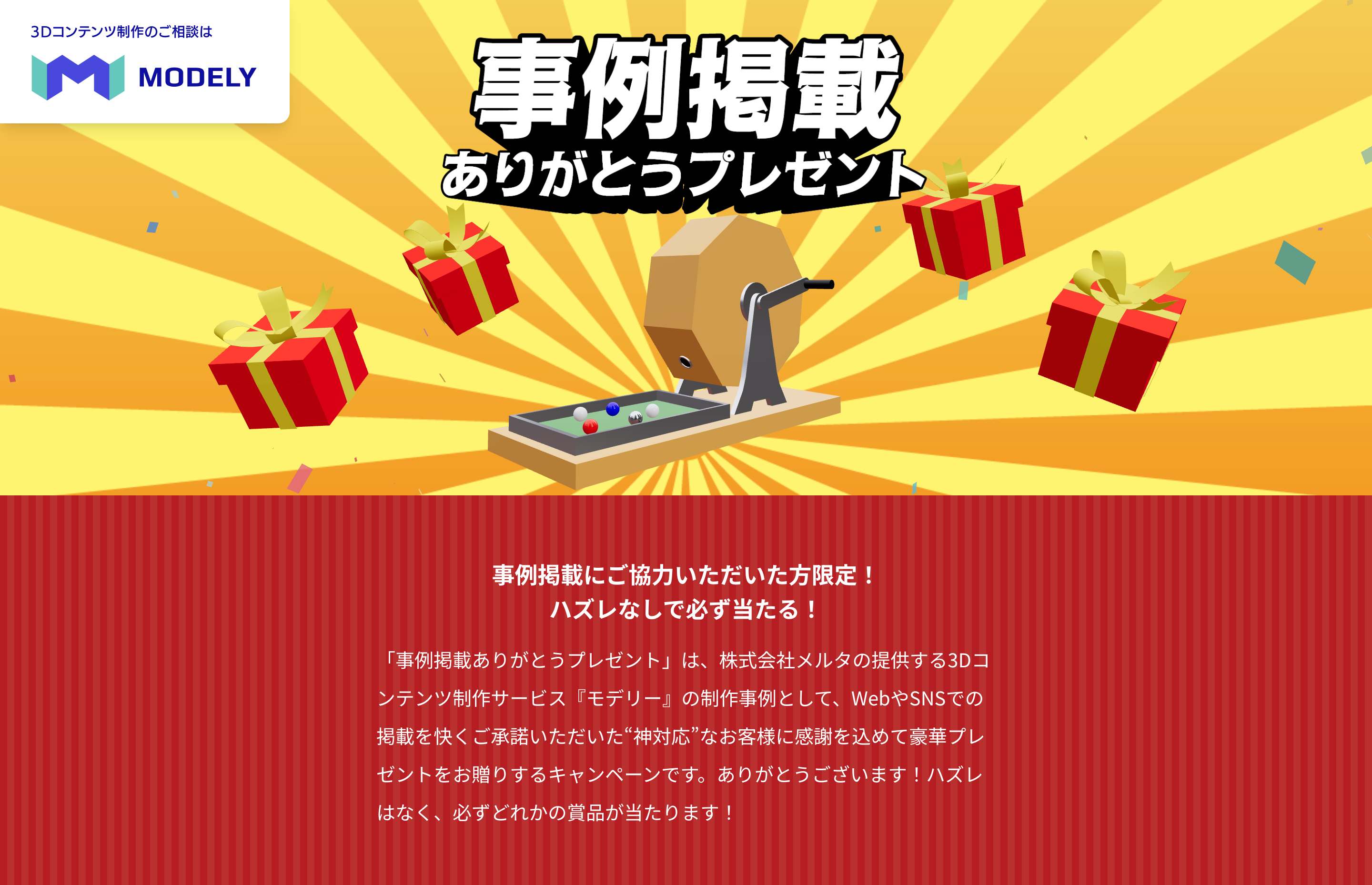 株式会社メルタ(本社:東京都墨田区、取締役社長:内野 博之)は、3Dコンテンツ制作における事例の掲載許可を円滑に得るための最終手段として、「事例掲載ありがとうプレゼント」を開始いたしました。掲載へのご承諾をいただいた法人顧客様に対し、感謝の気持ちとして豪華プレゼントをお贈りするキャンペーンです。本施策を通じて、より多くの事例紹介の実現と、顧客との協働関係の深化を目指します。