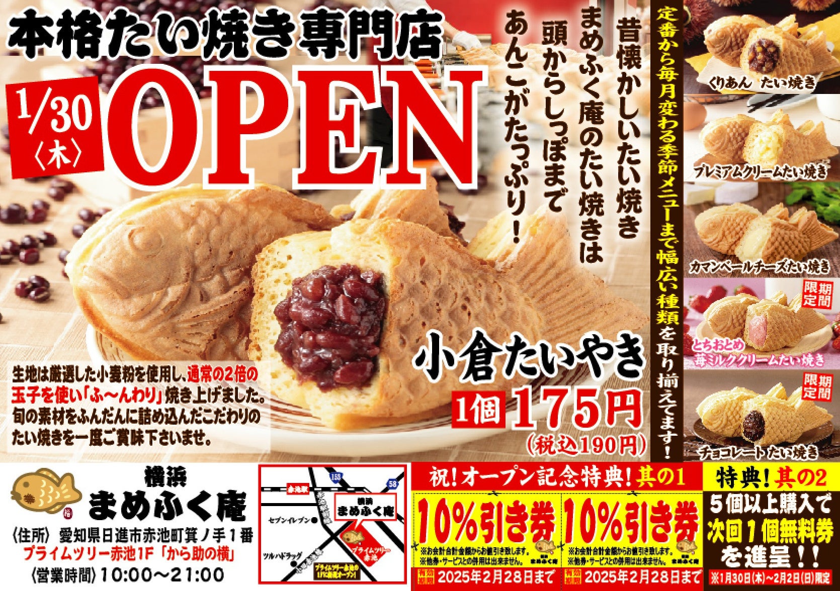 2025年1月30日(木)、愛知県日進市の商業施設『プライムツリー赤池』内に本格たい焼き専門店『横浜まめふく庵』がオープンいたします。