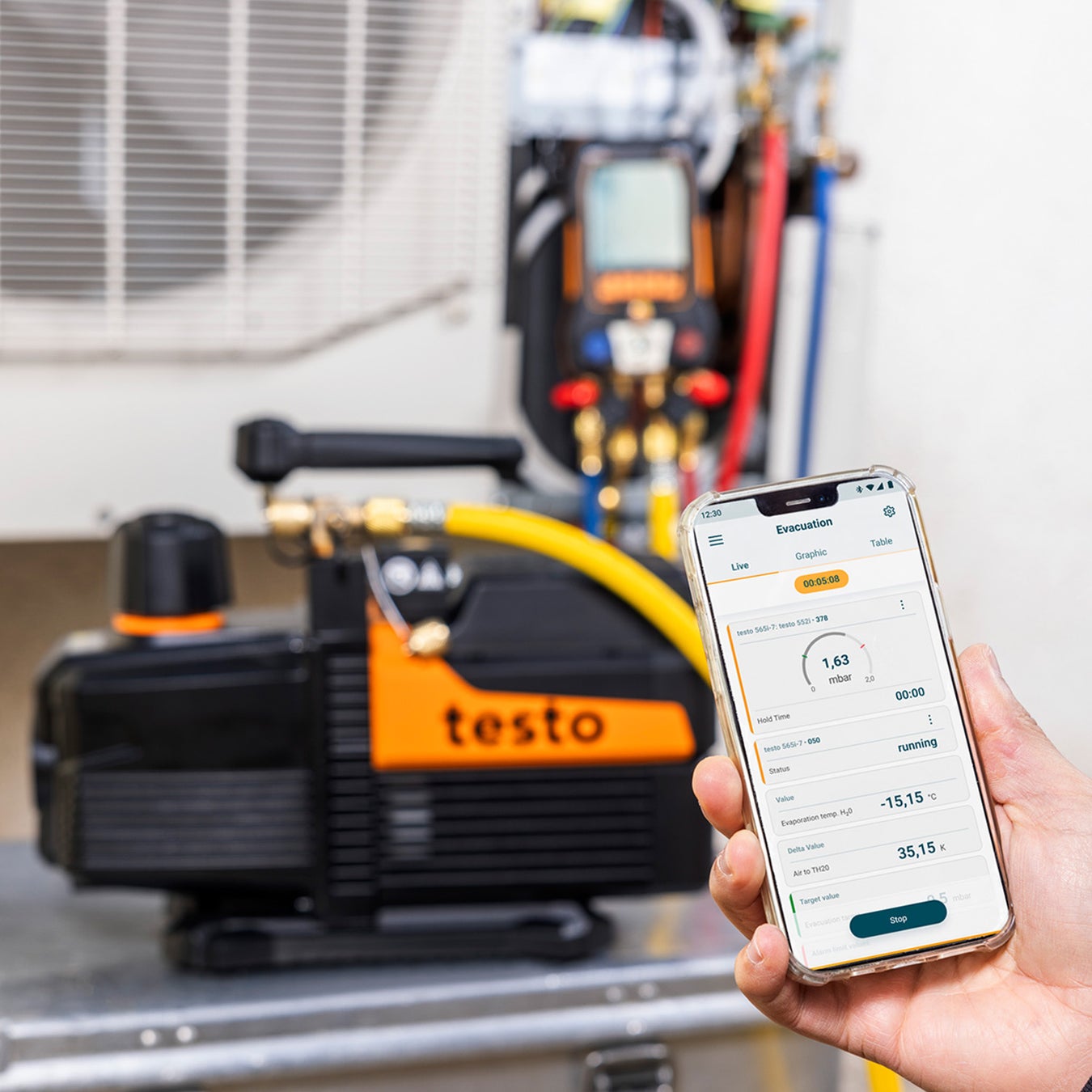 testo 565i と真空計、デジタルマニホールド、モバイルアプリを併用した真空引きの自動化