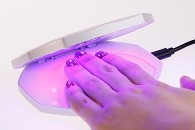 ライトで硬化させます。HOMEI コンパクトジェルライト25なら、25秒で硬化します。