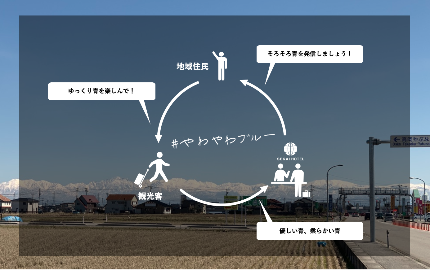 高岡市民の「もっと地元の魅力を発信したい」という想いに対するSEKAI HOTELからの『そろそろ高岡が誇る魅力的な青を発信しましょう』というメッセージでもあります。