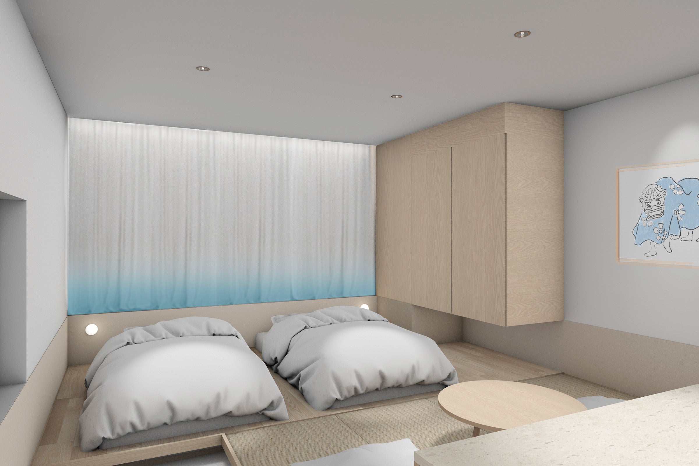 全体的に“柔らかい”“優しい”イメージを受け取っていただくための曲線や色を組み合わせ、空間の中で「青が目に留まる」「青を手に取る」体験を促す青のコーディネートを意識したホテルデザインです。