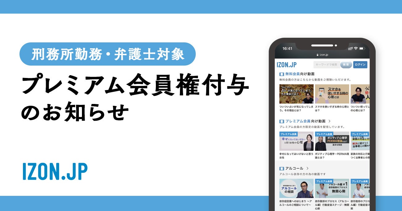 定額で依存症について学ぶ動画スクール『IZON.JP』|刑務所勤務・弁護士を対象に無料でプレミアム会員権を付与|ワンネス財団