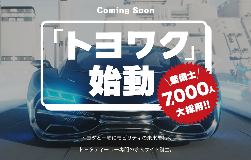 全国のトヨタ販売店で、7,000人が不足していると言われる自動車整備士の採用を強化、トヨタで働く「うれしみ」をコンセプトにした、自動車整備士目線の求人サイトが誕生します