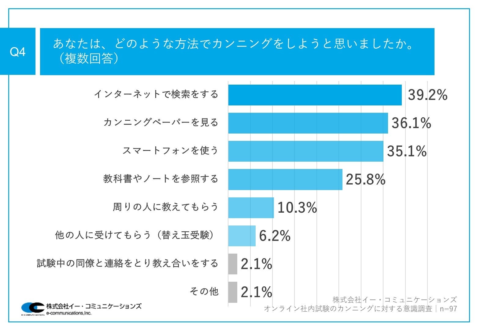 Q1で「したことはないが、しようと思ったことはある」と回答した方に、「Q4.あなたは、どのような方法でカンニングをしようと思いましたか。(複数回答)」(n=97)と質問したところ、「インターネットで検索をする」が39.2%、「カンニングペーパーを見る」が36.1%、「スマートフォンを使う」が35.1%という回答となりました。