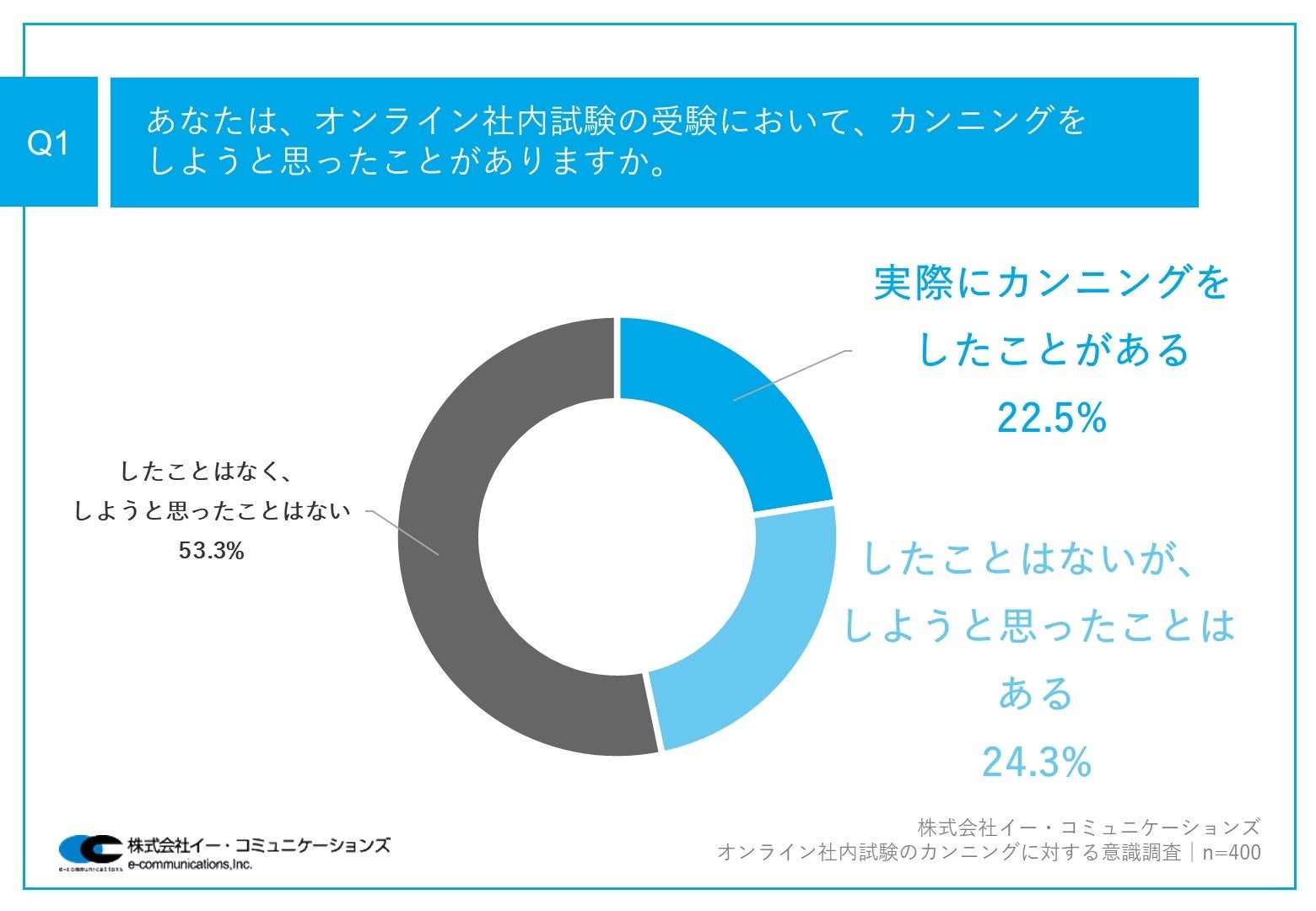 「Q1.あなたは、オンライン社内試験の受験において、カンニングをしようと思ったことがありますか。」(n=400)と質問したところ、「実際にカンニングをしたことがある」が22.5%、「したことはないが、しようと思ったことはある」が24.3%という回答となりました。