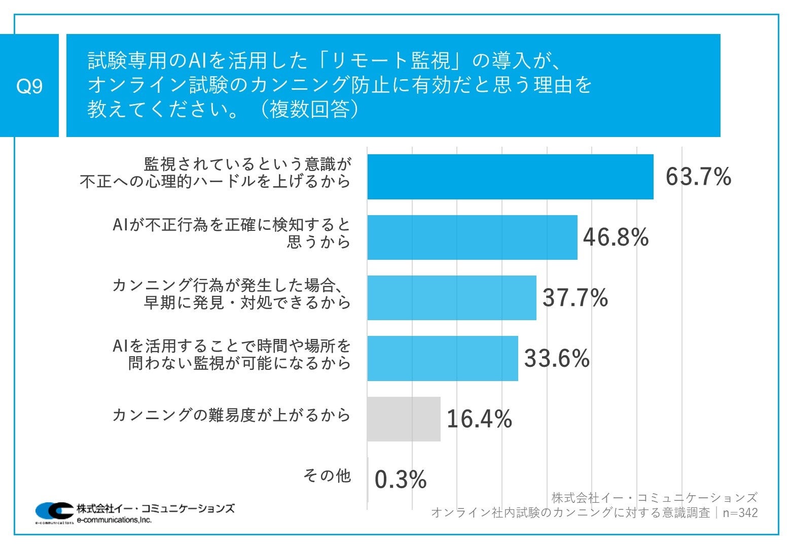 Q8で「非常にそう思う」「ややそう思う」と回答した方に、「Q9.試験専用のAIを活用した「リモート監視」の導入が、オンライン試験のカンニング防止に有効だと思う理由を教えてください。(複数回答)」(n=342)と質問したところ、「監視されているという意識が不正への心理的ハードルを上げるから」が63.7%、「AIが不正行為を正確に検知すると思うから」が46.8%、「カンニング行為が発生した場合、早期に発見・対処できるから」が37.7%という回答となりました。