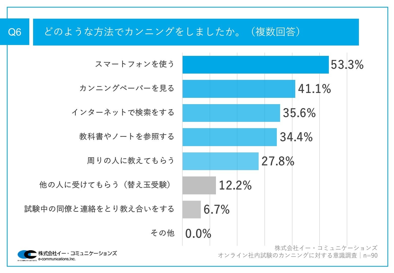 Q1で「実際にカンニングをしたことがある」と回答した方に、「Q6.どのような方法でカンニングをしましたか。(複数回答)」(n=90)と質問したところ、「スマートフォンを使う」が53.3%、「カンニングペーパーを見る」が41.1%、「インターネットで検索をする」が35.6%という回答となりました。
