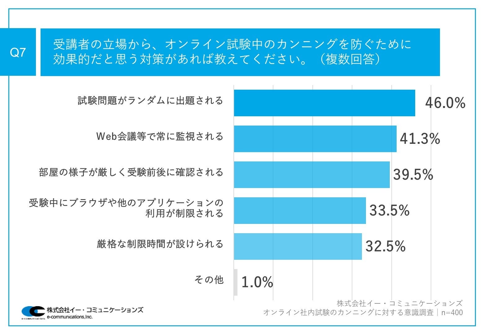 「Q7.受講者の立場から、オンライン試験中のカンニングを防ぐために効果的だと思う対策があれば教えてください。(複数回答)」(n=400)と質問したところ、「試験問題がランダムに出題される」が46.0%、「Web会議等で常に監視される」が41.3%、「部屋の様子が厳しく受験前後に確認される」が39.5%という回答となりました。