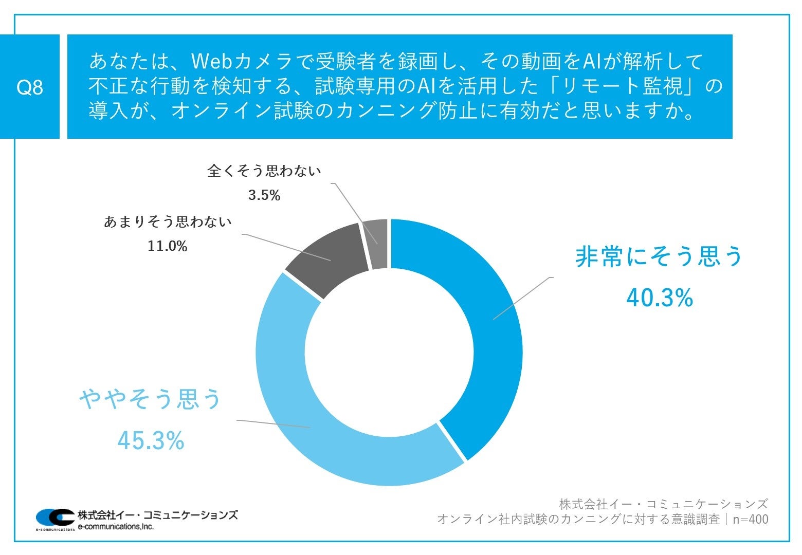 「Q8.あなたは、Webカメラで受験者を録画し、その動画をAIが解析して不正な行動を検知する、試験専用のAIを活用した「リモート監視」の導入が、オンライン試験のカンニング防止に有効だと思いますか。」(n=400)と質問したところ、「非常にそう思う」が40.3%、「ややそう思う」が45.3%という回答となりました。