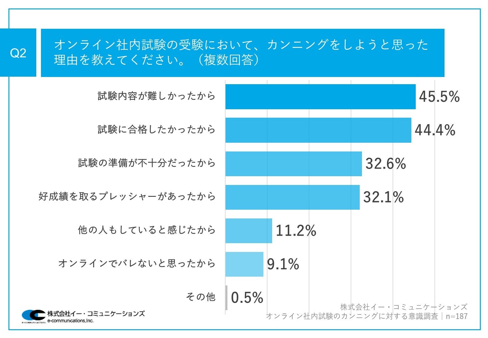 Q1で「実際にカンニングをしたことがある」「したことはないが、しようと思ったことはある」と回答した方に、「Q2.オンライン社内試験の受験において、カンニングをしようと思った理由を教えてください。(複数回答) 」(n=187)と質問したところ、「試験内容が難しかったから」が45.5%、「試験に合格したかったから」が44.4%、「試験の準備が不十分だったから」が32.6%という回答となりました。