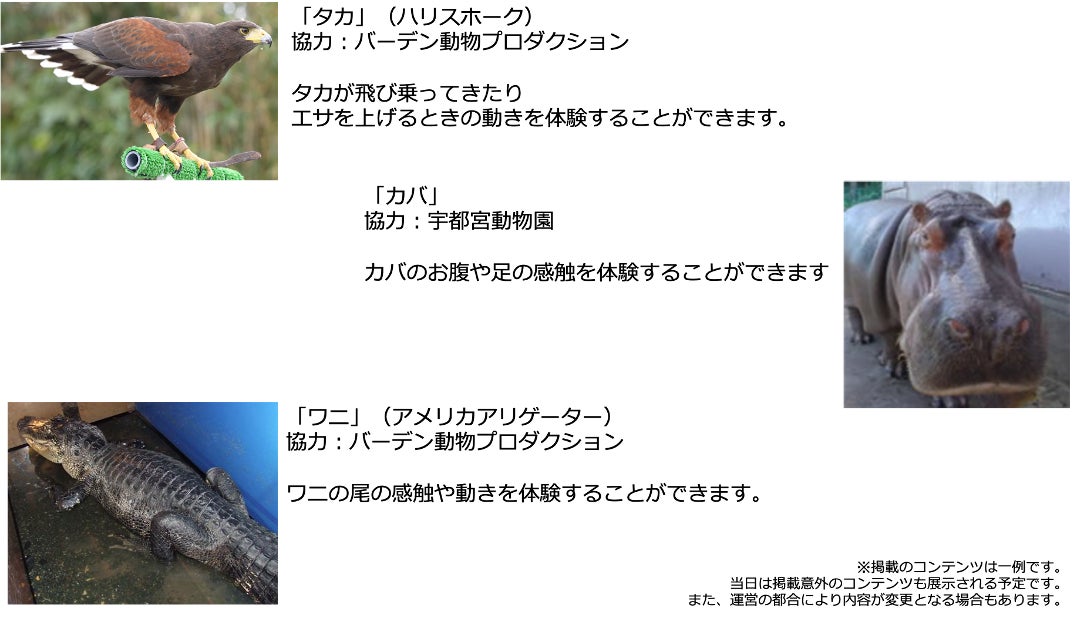 同プロジェクトでは宇都宮動物園(本社:栃木県宇都宮市、園長:荒井賢治)、動物プロダクション有限会社バーデン(本社:千葉県旭市、代表取締役社長:二階堂貴之)の協力のもと、感触制御技術リアルハプティクス®︎を使ってタカやワニ、カバなどの実際の感触・運動データを採取することに成功しました。