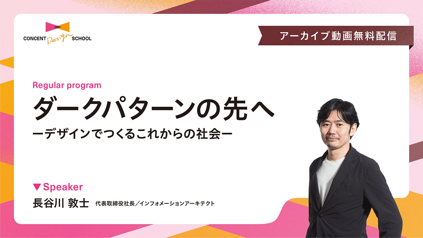 今回、アーカイブ動画を公開したCONCENT DESIGN SCHOOL「ダークパターンの先へ ーデザインでつくるこれからの社会ー」は、ダークパターンという問題に対し、「防止」を超え、そもそもダークパターン的な問題が起きないよう、デザインでできる可能性を考えていくため開催したものです。スピーカーはコンセント代表取締役社長の長谷川敦士が務めました。
