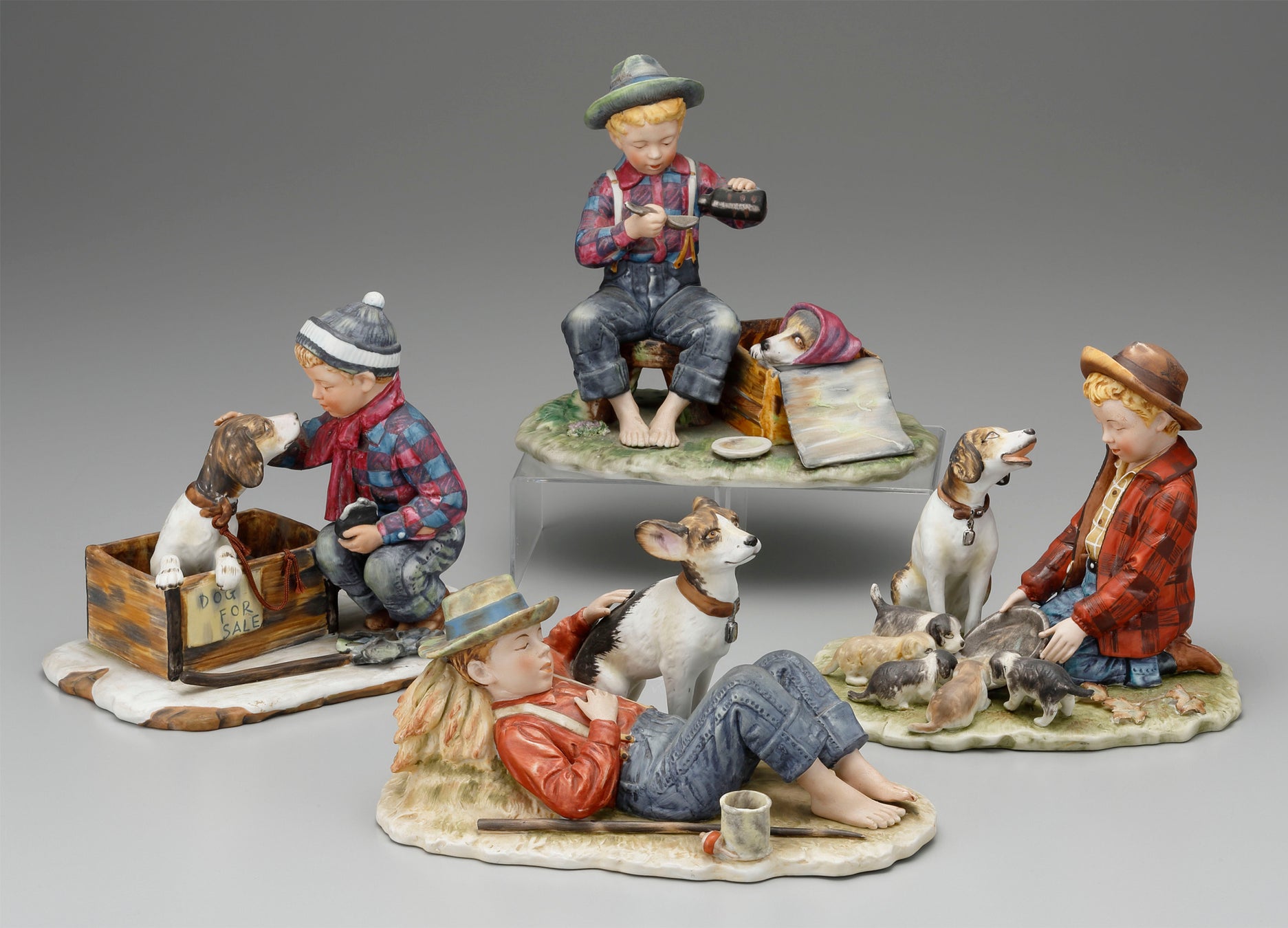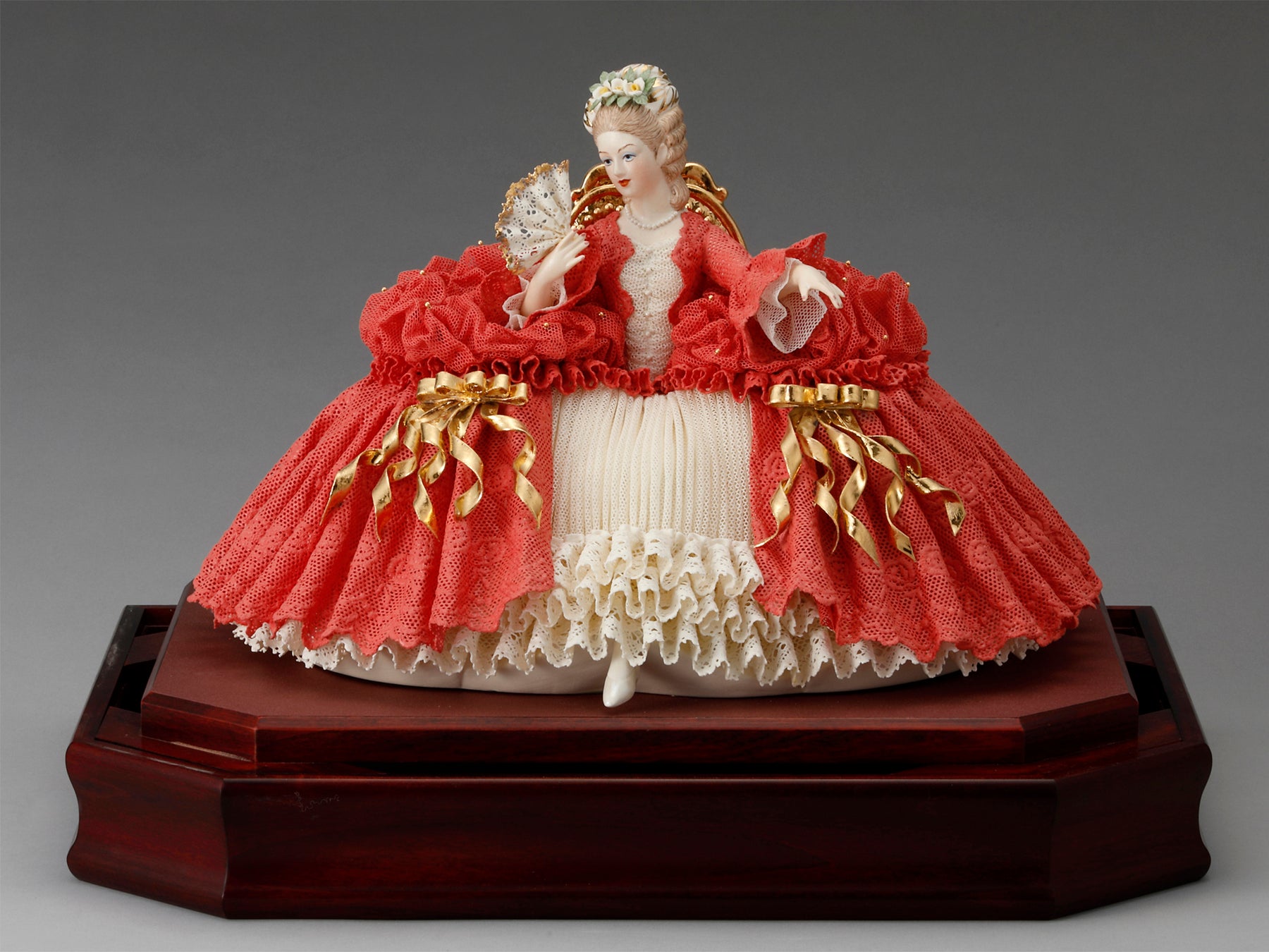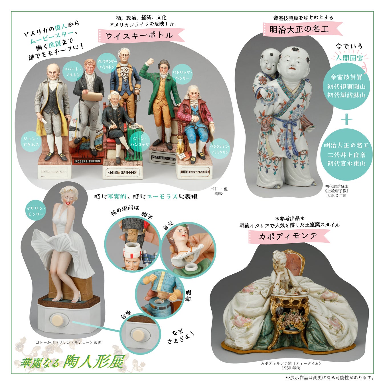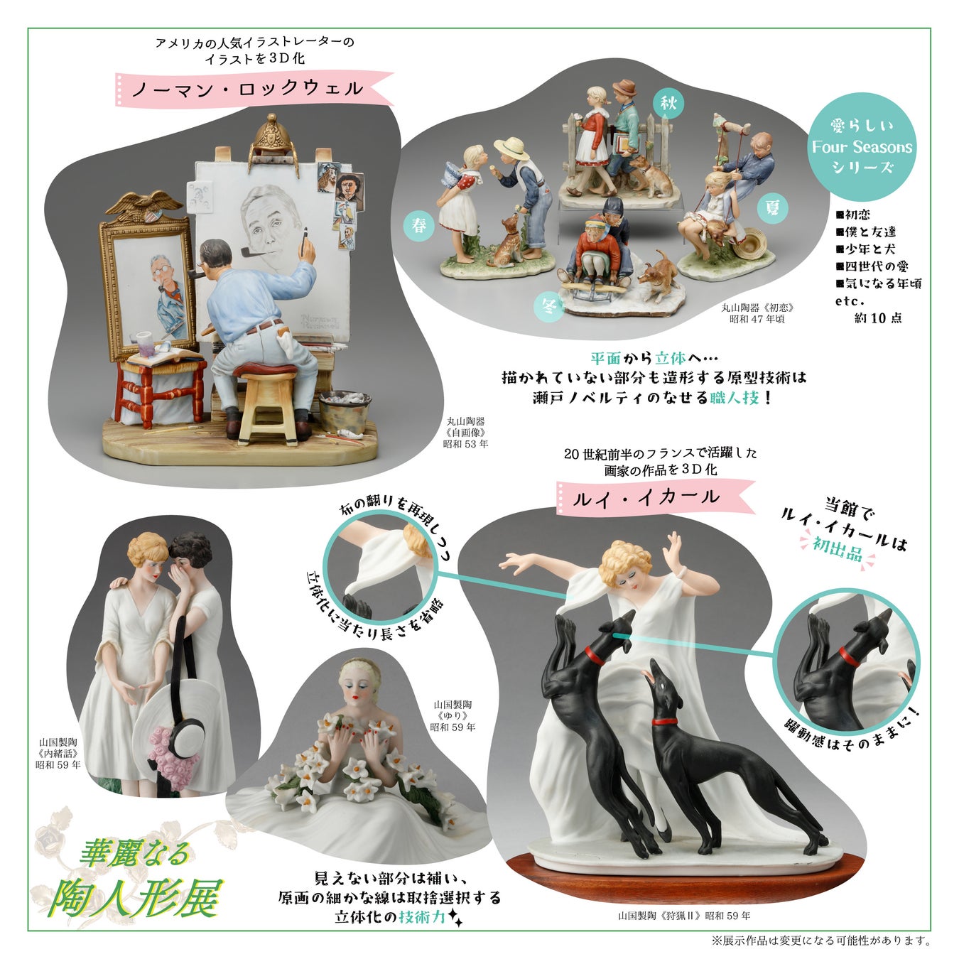 瀬戸焼のロココ風西洋人形から、ノーマン・ロックウェルやルイ・イカールの絵画作品を立体化したもの、レース人形、人をかたどったウイスキーボトルまで…戦後の輸出品を中心に紹介する、愛らしい陶人形の世界