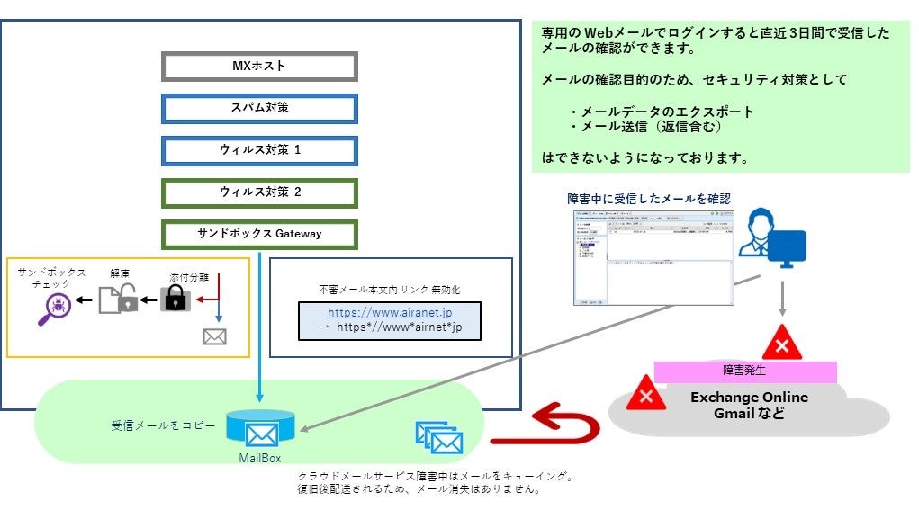 受信メールのセキュリティ強化に加え、ご利用のメールサービス(Exchange Online や Gmail など)に障害が発生し、受信メールの確認ができない場合でも「セキュリティプラス」を通過したメールのコピーを一定期間保存し、メール本文・添付ファイルの確認ができる「キープメール」機能をオプションとしてご利用いただけます。
