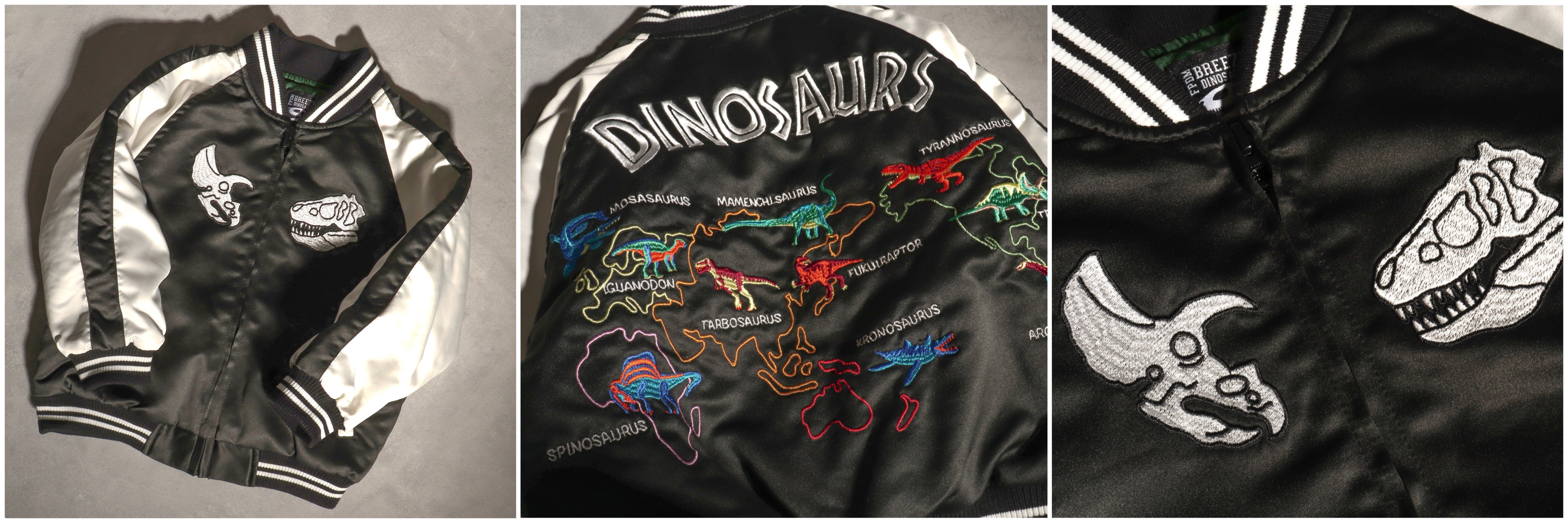 バックプリントは世界地図になっていて、各エリアで生息していた恐竜がデザインされています。フロントもバックプリントも刺繍になっていて、細かい箇所までこだわった特別なアイテムです。