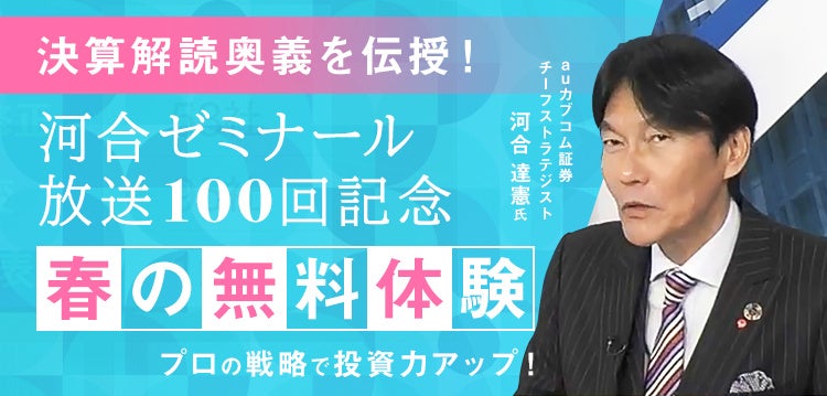 「河合ゼミナール」は2021年4月2日(金)の開始以来、「企業決算マニア」を自任するauカブコム証券の河合達憲チーフストラテジストが講師を務めてきました。100回記念の特別講義では、河合氏が企業決算のどこに注目し、どのように分析しているのか、「虎の巻」を伝授します。