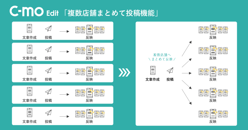 ローカルビジネスDX事業を展開し、SaaS型統合マーケティングツール「C-mo」を提供する株式会社CS-C(本社:東京都港区、代表取締役:椙原 健)は、2022年12月5日にGoogleビジネスプロフィール・SNS・オウンドメディア等を一括編集・発信ができるC-mo Edit(シーモ エディット)の新機能「複数店舗まとめて投稿機能」を追加リリースしたことをお知らせいたします。これにより、情報発信の生産性向上と発信力の強化による認知度拡大を実現します。